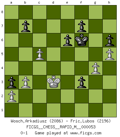 Last move : 0-1 2012 October 4 22:23:55 [Event "FICGS__CHESS__RAPID_M__000053"] [Site "FICGS"] [Date "2012.05.01"] [Round "1"] [White "Wosch,Arkadiusz"] [Black "Fric,Lubos"] [Result "0-1"] [WhiteElo "2086"] [BlackElo "2196"] 1.e4 c6 2.d4 d5 3.Nc3 dxe4 4.Nxe4 Bf5 5.Ng3 Bg6 6.h4 h6 7.Nf3 Nd7 8.h5 Bh7 9.Bd3 Bxd3 10.Qxd3 e6 11.Bf4 Qa5+ 12.Bd2 Bb4 13.c3 Be7 14.c4 Qc7 15.O-O-O Ngf6 16.Kb1 O-O 17.Rhe1 Rad8 18.Qe2 Rfe8 19.Ne5 c5 20.Bc3 cxd4 21.Bxd4 a5 22.f3 a4 23.Nxd7 Rxd7 24.Bxf6 Rxd1+ 25.Rxd1 gxf6 26.Ne4 a3 27.g4 Kg7 28.b3 Rd8 29.Rxd8 Qxd8 30.Kc2 Qd4 31.Qd2 Qe5 32.Qc3 Qh2+ 33.Qd2 Qh1 34.Qe2 Bb4 35.Kd3 Qa1 36.c5 f5 37.Kc4 fxe4 38.Kxb4 Qd4+ 39.Qc4 Qxc4+ 40.Kxc4 exf3 41.Kd3 Kf6 0-1 Caro-Kann : Classical, 7...Nd7 Queenside Castling by player White (move 15) Kingside Castling by player Black (move 16) Player Black won this chess game. Follow this game move after move (download)Checkers is for tramps. (Paul Morphy) Mutter, ich bin eben Ex-Weltmeister geworden. --beim nach Hause Kommen nach dem Verlust des WM-Titels an Mihail Botvinnik -- (Mikhail Nekhemyevich Tal) Hay dos clases de hombres: aquellos que se conforman en dejarse llevar por las circunstancias y que juegan barajas y aquellos decididos a controlar las circunstancias y que juegan al Ajedrez. (Mortimer Collins) Psychologiquement, tu dois avoir confiance en toi même, mais cette confiance doit être basée sur des faits. (Robert Fischer) A person who never made a mistake never tried anything new. (Albert Einstein)