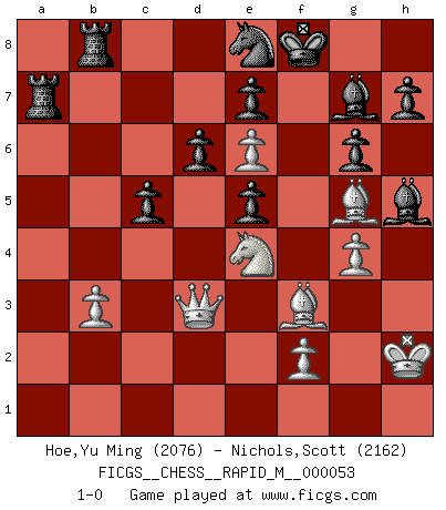 Last move : 1-0 2012 October 14 20:24:48 [Event "FICGS__CHESS__RAPID_M__000053"] [Site "FICGS"] [Date "2012.05.01"] [Round "1"] [White "Hoe,Yu Ming"] [Black "Nichols,Scott"] [Result "1-0"] [WhiteElo "2076"] [BlackElo "2162"] 1.d4 Nf6 2.c4 g6 3.g3 Bg7 4.Bg2 c5 5.d5 d6 6.Nc3 O-O 7.Nf3 a6 8.O-O b5 9.cxb5 Nbd7 10.bxa6 Bxa6 11.Qc2 Nb6 12.Rd1 Qc7 13.e4 Rfb8 14.h3 Ne8 15.b3 Nd7 16.Bf4 Rb4 17.a3 R4b8 18.Re1 Qb6 19.Rab1 Qa5 20.e5 Qxa3 21.e6 fxe6 22.Ng5 e5 23.Bc1 Qb4 24.Bd2 Qb7 25.Nce4 Nf8 26.h4 Bb5 27.Ne6 Nxe6 28.dxe6 Qa6 29.Ra1 Qxa1 30.Rxa1 Rxa1+ 31.Kh2 Be2 32.Bg5 Bd1 33.Qd3 Kf8 34.h5 Bxh5 35.Bf3 Ra7 36.g4 1-0 King's Indian : 3.g3 Kingside Castling by player Black (move 6) Kingside Castling by player White (move 8) Player White won this chess game. Follow this game move after move (download)Becoming successful at Chess allows you to discover your own personality. That's what I want for the kids I teach. (Saudin Robovic) Die unerbitterlichsten Regeln im Schach sind die Ausnahmen. (Savielly Grigorievitsch Tartakower) La maestría del Ajedrez consiste esencialmente en analizar posiciónes de Ajedrez con precisión. (Mikhail Botvinnik) Botvinnik disait en comparant les échecs à la musique: Il existe une science dont le but est l'étude de l'acoustique et des sons. Mais il y a aussi un art qui se sert de l'océan des sons : c'est la musique. De toute évidence, il en est de même pour la pensée. La logique est l'étude des lois de la réflexion et les échecs reflètent, en tant qu'art, le côté logique de la réflexion, sous la forme d'images artistiques... Extrait de Fischer - Spassky, Reykjavik 1972 par Alexander & F. Wyndham (Ed. Solar), p 37. A proverb is a short sentence based on long experience. (Miguel de Cervantes)