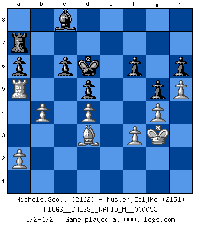 Last move : 1/2-1/2 2012 August 27 20:11:14 [Event "FICGS__CHESS__RAPID_M__000053"] [Site "FICGS"] [Date "2012.05.01"] [Round "1"] [White "Nichols,Scott"] [Black "Kuster,Zeljko"] [Result "1/2-1/2"] [WhiteElo "2162"] [BlackElo "2151"] 1.d4 g6 2.c4 Bg7 3.e4 d6 4.h3 Nf6 5.Nc3 O-O 6.Nf3 a6 7.Bd3 c6 8.Be3 b5 9.O-O Nbd7 10.e5 Ne8 11.exd6 exd6 12.Re1 Nc7 13.Rc1 Nf6 14.Bg5 Ne6 15.Bh4 Bb7 16.Ne4 bxc4 17.Bxc4 d5 18.Nxf6+ Bxf6 19.Bxf6 Qxf6 20.Bf1 Rfc8 21.Qb3 Rc7 22.Qb6 Qd8 23.h4 Re7 24.Qxd8+ Rxd8 25.Ng5 Rde8 26.Nxe6 Rxe6 27.Rxe6 Rxe6 28.f3 Re8 29.Rc3 Ra8 30.Kf2 Kf8 31.Rb3 Ra7 32.Re3 Bc8 33.Rc3 Rc7 34.Kg3 Ke7 35.Kf4 f6 36.g4 Kd6 37.Ra3 Ra7 38.Bd3 Ra8 39.h5 g5+ 40.Kg3 h6 41.b4 Ra7 42.Ra5 1/2-1/2 Modern defense Kingside Castling by player Black (move 5) Kingside Castling by player White (move 9) This chess game ended in a draw. Follow this game move after move (download)Combinations have always been the most intriguing aspect of Chess. The masters look for them, the public applauds them, the critics praise them. It is because combinations are possible that Chess is more than a lifeless mathematical exercise. They are the poetry of the game; they are to Chess what melody is to music. They represent the triumph of mind over matter. (Reuben Fine) Oft bringt ein stiller Zug das Erdbeben. (Richard Reti) Todo se encuentra en un estado de flujo y esto incluye al mundo del Ajedrez. (Mikhail Botvinnik) Soyez une menace à chaque fois que vous vous asseyez pour jouer. (Ken Smith) Winning isn't everything... but losing is nothing. (Mednis)
