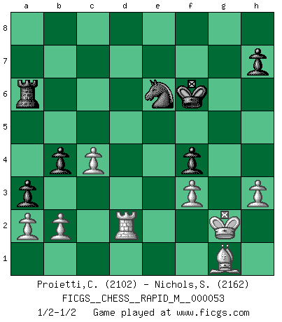 Last move : 1/2-1/2 2012 May 28 13:51:55 [Event "FICGS__CHESS__RAPID_M__000053"] [Site "FICGS"] [Date "2012.05.01"] [Round "1"] [White "Proietti,Costantino"] [Black "Nichols,Scott"] [Result "1/2-1/2"] [WhiteElo "2102"] [BlackElo "2162"] 1.e4 d6 2.d4 Nf6 3.Nc3 g6 4.Nf3 Bg7 5.Be2 O-O 6.O-O c6 7.h3 Nbd7 8.Be3 b5 9.e5 Ne8 10.Re1 b4 11.Ne4 dxe5 12.dxe5 Nc7 13.Bg5 a5 14.Qd2 Ne6 15.Rad1 Nxe5 16.Qxd8 Rxd8 17.Rxd8+ Nxd8 18.Bxe7 Ne6 19.Nf6+ Bxf6 20.Bxf6 Nd7 21.Bh4 Ba6 22.Bxa6 Rxa6 23.Rd1 Nb6 24.Ne5 Nd5 25.Nxc6 Rxc6 26.Rxd5 f5 27.Rd2 g5 28.Bg3 f4 29.Bh2 a4 30.g3 Kg7 31.Kg2 Kf6 32.gxf4 gxf4 33.f3 Ra6 34.Bg1 a3 35.c4 1/2-1/2 Pirc : Classical system, 5.Be2 Kingside Castling by player Black (move 5) Kingside Castling by player White (move 6) This chess game ended in a draw. Follow this game move after move (download)White lost because he failed to remember the right continuation and had to think up the moves himself. (Siegbert Tarrasch) Sitze auf Deine Hände. (Siegbert Tarrasch) Un Peón pasado aumenta su poder a medida de que el número de piezas en el tablero disminuye. (Capablanca) Le succès, c'est être capable d'aller d'échec en échec sans perdre son enthousiasme. (Winston Churchill) The problem with manipulation is that people can turn on you. (Horatio Caine, C.S.I. Miami)
