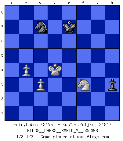 Last move : 1/2-1/2 2012 October 19 11:25:55 [Event "FICGS__CHESS__RAPID_M__000053"] [Site "FICGS"] [Date "2012.05.01"] [Round "1"] [White "Fric,Lubos"] [Black "Kuster,Zeljko"] [Result "1/2-1/2"] [WhiteElo "2196"] [BlackElo "2151"] 1.d4 g6 2.e4 Bg7 3.Nf3 d6 4.Nc3 a6 5.Bc4 e6 6.O-O Ne7 7.a4 b6 8.d5 O-O 9.dxe6 Bxe6 10.Bxe6 fxe6 11.Ng5 Qd7 12.Qg4 e5 13.Qe6+ Qxe6 14.Nxe6 Rc8 15.Bg5 Nbc6 16.f4 exf4 17.Rxf4 Be5 18.Rf2 b5 19.axb5 axb5 20.Rxa8 Rxa8 21.Nxb5 Ra1+ 22.Rf1 Bxh2+ 23.Kf2 Rxf1+ 24.Kxf1 d5 25.Bxe7 Nxe7 26.Nbxc7 dxe4 27.Ke2 Kf7 28.Ke3 g5 29.Kxe4 g4 30.c3 h5 31.Nf4 h4 32.Nce6 Kf6 33.Nd4 Bxf4 34.Kxf4 h3 35.gxh3 gxh3 36.Nf3 Nd5+ 37.Ke4 Nc7 38.b4 Ke7 39.Kd4 1/2-1/2 Modern defense Kingside Castling by player White (move 6) Kingside Castling by player Black (move 8) 10 pieces endgame at move 33 : White KNPPP , Black KBNPP WHITE : King + 1 Knight 3 Pawns BLACK : King + 1 Bishop 1 Knight 2 Pawns 9 pieces endgame at move 34 : White KNPPP , Black KNPP WHITE : King + 1 Knight 3 Pawns BLACK : King + 1 Knight 2 Pawns 8 pieces endgame at move 35 : White KNPPP , Black KNP WHITE : King + 1 Knight 3 Pawns BLACK : King + 1 Knight 1 Pawn 7 pieces endgame at move 35 : White KNPP , Black KNP WHITE : King + 1 Knight 2 Pawns BLACK : King + 1 Knight 1 Pawn This chess game ended in a draw. Follow this game move after move (download)The game of chess is the touchstone of the intellect. (Goethe) Man kann eine Schachpartie nur gewinnen, wenn das Gleichgewicht gestört ist. In einer Stellung mit ungestörtem Gleichgewicht ist auch das größte Genie hilflos - in der Stellung steckt dann eben kein genialer Einfall. (Wilhelm Steinitz) Nunca antes ha habido un jugador de Ajedrez con tal conocimiento a fondo de las complejidades del juego y una inmensa voluntad absolutamente indomable de ganar. Yo pienso que Fischer es el jugador mas grande que jamás haya existido. (Lisa Lane) Tous ces prétendus hommes politiques sont les pions, les Cavaliers, les Tours ou les Fous d'une partie d'échecs qui se jouera tant qu'un hasard ne renversera pas l'échiquier. (Honoré de Balzac) No enterprise is more likely to succeed than one concealed from the enemy until it is ripe for execution. (Niccolo Machiavelli)