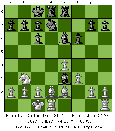 Last move : 1/2-1/2 2012 September 7 9:13:50 [Event "FICGS__CHESS__RAPID_M__000053"] [Site "FICGS"] [Date "2012.05.01"] [Round "1"] [White "Proietti,Costantino"] [Black "Fric,Lubos"] [Result "1/2-1/2"] [WhiteElo "2102"] [BlackElo "2196"] 1.e4 e5 2.Nf3 Nc6 3.d4 exd4 4.Nxd4 Bc5 5.Nxc6 Qf6 6.Qf3 dxc6 7.Qxf6 Nxf6 8.f3 Be6 9.Nd2 O-O-O 10.Nb3 Bb6 11.Bd2 Rhe8 12.O-O-O Nd7 13.Be2 f6 14.Bc3 Be3+ 15.Bd2 1/2-1/2 Scotch game Queenside Castling by player Black (move 9) Queenside Castling by player White (move 12) This chess game ended in a draw. Follow this game move after move (download)Bobby is the most misunderstood, misquoted celebrity walking the face of this earth. (Yasser Seirawan) Sicherlich können nur Meister einen Stil haben. Daß ein nicht-Meister auch nur ein einziges Mal in seinem Leben eine Partie folgerecht durchführte, habe ich niemals bemerkt. (Emanuel Lasker) Un entendimiento a fondo de las continuaciones típicas del mate, hace de las combinaciones de sacrificio mas complicadas conducirlas a ellas no solo sin dificultad, sino casi de una manera natural. (Siegbert Tarrasch) Une platitude souvent récitée à propos des Echecs est qu'une des choses les plus difficiles à réaliser est de gagner une position gagnante. Cela ne manque pas de sens mais, pour ma part, j'ai toujours trouvé plus difficile de gagner une position perdante. (Tim Krabbe) There's always a bigger fish. (Qui-Gon Jinn in Star Wars ep.1)