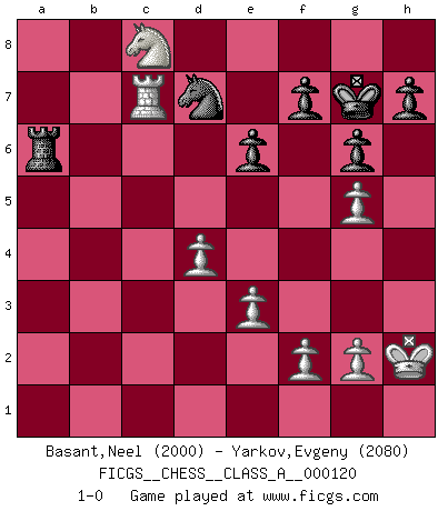 Last move : 1-0 2013 April 4 15:2:6 [Event "FICGS__CHESS__CLASS_A__000120"] [Site "FICGS"] [Date "2012.05.02"] [Round "1"] [White "Basant,Neel"] [Black "Yarkov,Evgeny"] [Result "1-0"] [WhiteElo "2000"] [BlackElo "2080"] 1.Nf3 d5 2.d4 Nf6 3.c4 c6 4.Bd2 dxc4 5.e3 b5 6.a4 a6 7.axb5 cxb5 8.b3 cxb3 9.Bxb5+ Bd7 10.Bxd7+ Nbxd7 11.Qxb3 e6 12.O-O Be7 13.Qd3 O-O 14.Rxa6 Nc5 15.Rxa8 Nxd3 16.Rxd8 Rxd8 17.Nc3 Bb4 18.Ne2 Ne4 19.Bxb4 Nxb4 20.Ng3 Nxg3 21.hxg3 Nd5 22.g4 Nf6 23.Ne5 Nd7 24.Nc6 Ra8 25.g5 Kf8 26.Rc1 g6 27.Kh2 Kg7 28.Ne7 Ra2 29.Nc8 Ra6 30.Rc7 1-0 Reti Opening Kingside Castling by player White (move 12) Kingside Castling by player Black (move 13) Player White won this chess game. Follow this game move after move (download)Chess is really ninety nine percent calculation. (Soltis) Im Schach gibt es keinen Platz für Galanterie. (Irving Chernev) Aquellos que dicen entender al Ajedrez, no entienden nada. (Robert Hubner) Il s'avisa de me proposer d'apprendre les échecs qu'il jouait un peu... me voilà forcené des échecs. J'achète un échiquier, je m'enferme dans ma chambre, j'y passe des jours et des nuits à vouloir apprendre par cur toutes les parties. (Jean-Jacques Rousseau, Confessions) A government big enough to give you everything you want is strong enough to take everything you have. (Thomas Jefferson)
