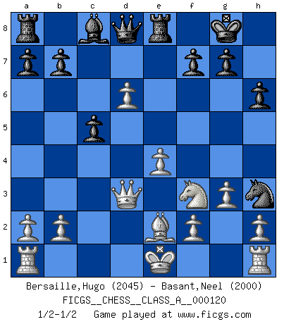 Last move : 1/2-1/2 2013 January 7 10:54:45 [Event "FICGS__CHESS__CLASS_A__000120"] [Site "FICGS"] [Date "2012.05.02"] [Round "1"] [White "Bersaille,Hugo"] [Black "Basant,Neel"] [Result "1/2-1/2"] [WhiteElo "2045"] [BlackElo "2000"] 1.Nc3 Nf6 2.e4 e5 3.Nf3 Nc6 4.Bc4 Bc5 5.d3 d6 6.Bg5 h6 7.Bxf6 Qxf6 8.Nd5 Qd8 9.c3 Ne7 10.d4 exd4 11.cxd4 Nxd5 12.dxc5 Nf4 13.g3 Nh3 14.cxd6 O-O 15.Qd4 Re8 16.Bb5 c6 17.Be2 c5 18.Qd3 1/2-1/2 Dunst (Sleipner, Heinrichsen) Opening Kingside Castling by player Black (move 14) This chess game ended in a draw. Follow this game move after move (download)It was clear to me that the vulnerable point of the American Grandmaster (Bobby Fischer) was in double-edged, hanging, irrational positions, where he often failed to find a win even in a won position. (Efim Geller) Es ist schade, dass viele Schachsportler vergessen, wie wichtig Auftreten und angemessene Kleidung sind. (Alexandra Kosteniuk) El Ajedrez es un regaderazo frío para la mente. (Sir John Simon) Aux échecs, les retours au sommet sont rares : les dommages psychologiques consécutifs à une défaite sont trop sévères. (Daily Telegraph) If we knew what we were doing, we would not call it research. (Albert Einstein)