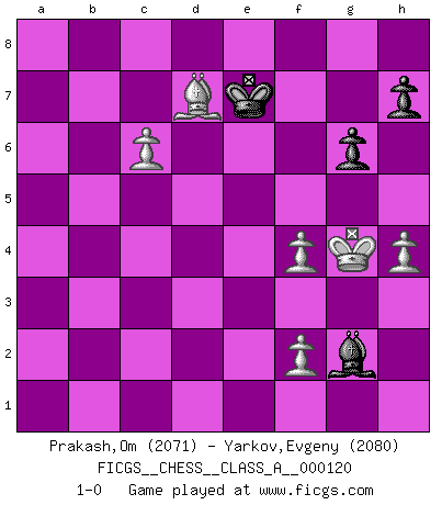 Last move : 1-0 2013 April 4 17:2:13 [Event "FICGS__CHESS__CLASS_A__000120"] [Site "FICGS"] [Date "2012.05.02"] [Round "1"] [White "Prakash,Om"] [Black "Yarkov,Evgeny"] [Result "1-0"] [WhiteElo "2071"] [BlackElo "2080"] 1.e4 c5 2.Nf3 Nc6 3.d4 cxd4 4.Nxd4 Nf6 5.Nc3 e5 6.Ndb5 d6 7.Bg5 a6 8.Na3 b5 9.Nd5 Be7 10.Bxf6 Bxf6 11.c3 O-O 12.Nc2 Bg5 13.a4 bxa4 14.Rxa4 a5 15.Bc4 Rb8 16.b3 Kh8 17.Nce3 g6 18.O-O f5 19.Qd3 f4 20.Nc2 Qd7 21.Rd1 Bd8 22.Bb5 Qb7 23.c4 Bg4 24.Rd2 Bd7 25.Ra1 Be6 26.Nxf4 Rxf4 27.Qxd6 Qd7 28.Bxc6 Qxd6 29.Rxd6 Bb6 30.Rf1 Bg4 31.Rd2 Rf6 32.Bb5 Rbf8 33.b4 axb4 34.Nxb4 Bc5 35.Nc6 Rf4 36.h3 Bc8 37.Re2 Bb7 38.Nxe5 Bxe4 39.g3 Bf3 40.gxf4 Bxe2 41.Re1 Bh5 42.Nd7 Rc8 43.Nxc5 Rxc5 44.Re5 Rc7 45.Kg2 Bd1 46.c5 Kg7 47.Rd5 Bb3 48.Rd7+ Rxd7 49.Bxd7 Kf6 50.c6 Bd5+ 51.Kg3 Ke7 52.Kg4 Bg2 53.h4 1-0 Sicilian : Pelikan (Lasker/Sveshnikov) variation Kingside Castling by player Black (move 11) Kingside Castling by player White (move 18) 10 pieces endgame at move 49 : White KBPPPP , Black KBPP WHITE : King + 1 Bishop 4 Pawns BLACK : King + 1 Bishop 2 Pawns Player White won this chess game. Follow this game move after move (download)Who is your opponent tonight, tonight I am playing against the Black pieces. (Akiba Rubinstein) Jeder weiß, dass Gasprom Putins persönliches Machtinstrument ist. Die Firma wird vom Kreml aus geleitet und wird schon deshalb nie transparent sein. (Garry Kasparov) El Ajedrez, como cualquier otra actividad creativa, puede existir solo a través de méritos combinados de aquellos que tienen talento creativo y de aquellos que tienen la habilidad de organizar un trabajo creativo. (Mikhail Botvinnik) On croit qu'il y a plus de mauvais joueurs que de bons joueurs, c'est faux : Il y a autant de joueurs qui gagnent que de joueurs qui perdent. (Philippe Geluck) The right perception of any matter and a misunderstanding of the same matter do not wholly exclude each other. (Kafka's the trial)