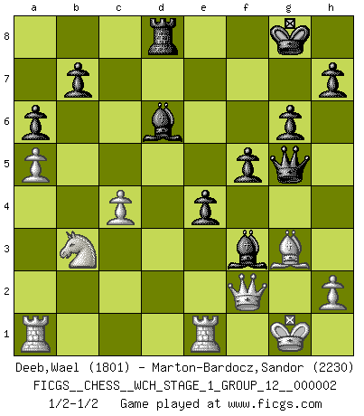 Last move : 1/2-1/2 2007 May 6 10:2:56 [Event "FICGS__CHESS__WCH_STAGE_1_GROUP_12__000002"] [Site "FICGS"] [Date "2007.01.16"] [Round "1"] [White "Deeb,Wael"] [Black "Marton-Bardocz,Sandor"] [Result "1/2-1/2"] [WhiteElo "1801"] [BlackElo "2230"] 1.e4 c5 2.Nf3 d6 3.d4 cxd4 4.Nxd4 Nf6 5.Nc3 a6 6.Be3 e5 7.Nb3 Be7 8.Be2 Be6 9.O-O Nbd7 10.a4 Rc8 11.Qd2 Nb6 12.a5 Nc4 13.Bxc4 Rxc4 14.Qd3 Qc8 15.Nd2 Qc6 16.Rfd1 Rb4 17.b3 d5 18.exd5 Nxd5 19.Nxd5 Bxd5 20.c4 Bxg2 21.Qf5 O-O 22.f3 g6 23.Qg4 Rxb3 24.Nxb3 Bxf3 25.Qd7 Qe4 26.Re1 Qh4 27.Bf2 Qg5+ 28.Bg3 Rd8 29.Qc7 Bd6 30.Qb6 e4 31.Qf2 f5 32.Kf1 Bg4 33.Kg1 Bf3 34.Kf1 Bg4 35.Kg1 Bf3 1/2-1/2 Sicilian : Najdorf, Byrne (English) attack Kingside Castling by player White (move 9) Kingside Castling by player Black (move 21) This chess game ended in a draw. Follow this game move after move (download)A player surprised is half beaten. (Proverb) Kasparov ist eine Art Monster mit hundert Augen, denen auch nicht das Geringste entgeht. (Tony Miles) La señal de un Gran Maestro es su habilidad de ganar una partida rápidamente y sin dolor. (Irving Chernev) Aucun coup ne doit être joué sans but. (Pedro Damiano) Imagination is more important than knowledge. Knowledge is limited. Imagination encircles the world. (Albert Einstein)
