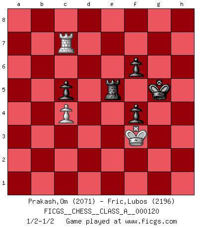 Last move : 1/2-1/2 2013 July 7 19:42:50 [Event "FICGS__CHESS__CLASS_A__000120"] [Site "FICGS"] [Date "2012.05.02"] [Round "1"] [White "Prakash,Om"] [Black "Fric,Lubos"] [Result "1/2-1/2"] [WhiteElo "2071"] [BlackElo "2196"] 1.e4 e5 2.Bc4 Nf6 3.d4 exd4 4.Nf3 Nxe4 5.Qxd4 Nf6 6.Bg5 Nc6 7.Qe3+ Qe7 8.Nc3 Qxe3+ 9.fxe3 Be7 10.Nb5 Bd8 11.O-O d6 12.Bd3 Be6 13.Bxf6 gxf6 14.Nbd4 Ne5 15.Nd2 c5 16.Nf5 d5 17.e4 Ba5 18.Rad1 Nxd3 19.cxd3 Rd8 20.exd5 Rxd5 21.Nc4 Bxf5 22.Rxf5 Rxf5 23.Nd6+ Ke7 24.Nxf5+ Ke6 25.Rf1 Rg8 26.Ng3 Rd8 27.Rf3 Rd5 28.Kf2 f5 29.Nh5 Re5 30.Nf4+ Kf6 31.Ne2 Bd2 32.g3 Rd5 33.Nc3 Bxc3 34.bxc3 c4 35.dxc4 Rd2+ 36.Ke3 Rxh2 37.a4 h5 38.c5 h4 39.gxh4 Rxh4 40.Rf1 Rxa4 41.Rb1 Re4+ 42.Kf2 Re7 43.Ra1 a6 44.c6 bxc6 45.Rxa6 Re6 46.Kf3 c5 47.Ra5 Re5 48.Ra6+ Kg5 49.Rc6 f4 50.c4 Kf5 51.Rc7 f6 52.Rc6 Re3+ 53.Kf2 Re5 54.Kf3 Kg5 55.Rc7 1/2-1/2 Bishop's Opening : Urusov gambit Kingside Castling by player White (move 11) 10 pieces endgame at move 40 : White KRPP , Black KRPPPP WHITE : King + 1 Rook 2 Pawns BLACK : King + 1 Rook 4 Pawns 9 pieces endgame at move 44 : White KRP , Black KRPPPP WHITE : King + 1 Rook 1 Pawn BLACK : King + 1 Rook 4 Pawns 8 pieces endgame at move 45 : White KRP , Black KRPPP WHITE : King + 1 Rook 1 Pawn BLACK : King + 1 Rook 3 Pawns This chess game ended in a draw. Follow this game move after move (download)Chess is a terrible game. If you have no center, your opponent has a freer position. If you do have a center, then you really have something to worry about ! (Siegbert Tarrasch) Der vorletzte Fehler gewinnt. (Savielly Grigorievitsch Tartakower) Bendita sea la memoria de aquel que dio al mundo este juego inmortal. (A. G. Gardiner) Il vaut mieux sacrifier les pièces de l'adversaire. (Xavier Tartacover) Begin at the beginning and go on till you come to the end; then stop. (Lewis Carrol, Alice in Wonderland)