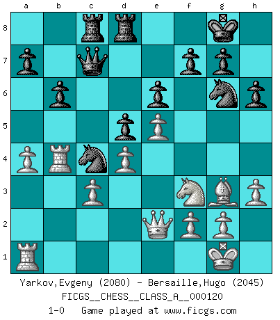 Last move : 1-0 2013 February 26 16:19:50 [Event "FICGS__CHESS__CLASS_A__000120"] [Site "FICGS"] [Date "2012.05.02"] [Round "1"] [White "Yarkov,Evgeny"] [Black "Bersaille,Hugo"] [Result "1-0"] [WhiteElo "2080"] [BlackElo "2045"] 1.e4 e6 2.d4 d5 3.Nc3 Bb4 4.e5 c5 5.a3 Bxc3+ 6.bxc3 Ne7 7.Qg4 Kf8 8.Bd2 b6 9.Bd3 Ba6 10.Nf3 Bxd3 11.cxd3 cxd4 12.Qxd4 Nbc6 13.Qe3 h6 14.O-O Rc8 15.Rac1 Kg8 16.a4 Qd7 17.Qe2 Kh7 18.d4 Rhd8 19.Ra1 Na5 20.Rfb1 Qc7 21.Rb4 Nc4 22.Bf4 Kg8 23.h3 Ng6 24.Bg3 1-0 This chess game has been lost on time (started : 2012.05.02 19:11:41) French : Winawer, Advance, poisoned pawn variation Kingside Castling by player White (move 14) Player White won this chess game. Follow this game move after move (download)A man that will take back a move at Chess will pick a pocket. (Richard Fenton) Als ich elf wurde, wurde ich einfach gut. (Robert James Fischer) El Ajedrez lo es todo: arte, ciencia y deporte. (Anatoly Karpov) Les échecs sont un jeu terrible. Si vous n'avez pas le centre, votre adversaire a une position plus libre. Par contre, si vous avez le centre, alors vous avez vraiment quelque chose pour laquelle vous inquiéter ! (Siegbert Tarrasch) You think that education is too expensive ? Try ignorance. (Derek Bok)