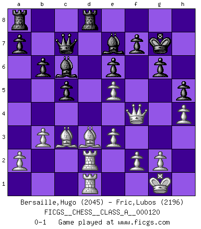 Last move : 0-1 2013 January 30 1:22:28 [Event "FICGS__CHESS__CLASS_A__000120"] [Site "FICGS"] [Date "2012.05.02"] [Round "1"] [White "Bersaille,Hugo"] [Black "Fric,Lubos"] [Result "0-1"] [WhiteElo "2045"] [BlackElo "2196"] 1.d4 Nf6 2.Nf3 e6 3.e3 b6 4.Bd3 Bb7 5.O-O d5 6.Ne5 Be7 7.Nd2 O-O 8.b3 Ne4 9.c4 Nd7 10.Qc2 Nxd2 11.Bxd2 Nxe5 12.dxe5 g6 13.Rfd1 dxc4 14.Qxc4 c5 15.Bc3 Qc7 16.h4 h5 17.Qf4 Rfd8 18.Rd2 Bc6 19.Rad1 Kg7 0-1 This chess game has been lost on time (started : 2012.05.02 19:11:41) Queen's pawn : Yusupov-Rubinstein system Kingside Castling by player White (move 5) Kingside Castling by player Black (move 7) Player Black won this chess game. Follow this game move after move (download)Excellence at Chess is one mark of a scheming mind. (Sir Arthur Conan Doyle) Ihnen, Herr Lasker, habe ich nur drei Worte zu sagen: Schach und matt. (Siegbert Tarrasch) El Ajedrez es un regaderazo frío para la mente. (Sir John Simon) Tous ces prétendus hommes politiques sont les pions, les Cavaliers, les Tours ou les Fous d'une partie d'échecs qui se jouera tant qu'un hasard ne renversera pas l'échiquier. (Honoré de Balzac) No man has ever achieved immortality in his own life time. (Unknown)