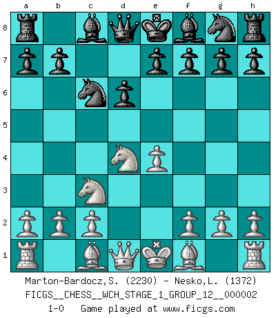 Last move : 1-0 2007 February 26 5:53:8 [Event "FICGS__CHESS__WCH_STAGE_1_GROUP_12__000002"] [Site "FICGS"] [Date "2007.01.16"] [Round "1"] [White "Marton-Bardocz,Sandor"] [Black "Nesko,Lawrence"] [Result "1-0"] [WhiteElo "2230"] [BlackElo "1372"] 1.e4 c5 2.Nf3 Nc6 3.d4 cxd4 4.Nxd4 d6 5.Nc3 1-0 This chess game has been lost on time (started : 2007.01.16 15:23:38) Sicilian defense Player White won this chess game. Follow this game move after move (download)I won't play with you anymore. You have insulted my friend. - When an opponent cursed himself for a blunder. (Miguel Najdorf) Ja, ich habe einmal eine Blitzpartie gespielt, es war in einem Zug, 1929. --im Interview 1989 (Mikhail Moiseyevich Botvinik) La estratégia requiere pensar, la táctica requiere observación. (Max Euwe) Même si vous avez un bon coup à faire, regardez toujours s'il n'y en a pas un qui lui soit préférable. (Pedro Damiano) For peace of mind, resign as general manager of the universe. (Douglas Adams)