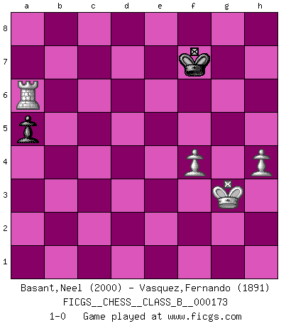Last move : 1-0 2013 November 7 7:54:21 [Event "FICGS__CHESS__CLASS_B__000173"] [Site "FICGS"] [Date "2012.05.03"] [Round "1"] [White "Basant,Neel"] [Black "Vasquez,Fernando"] [Result "1-0"] [WhiteElo "2000"] [BlackElo "1891"] 1.d4 Nf6 2.Nf3 g6 3.c4 Bg7 4.Nc3 d5 5.Bf4 O-O 6.Rc1 dxc4 7.e4 Bg4 8.Be3 Bxf3 9.Qxf3 Nc6 10.e5 Nd7 11.Bxc4 Nb6 12.Bd5 Nxd5 13.Qxd5 Nb4 14.Qe4 c6 15.O-O e6 16.g3 f6 17.a3 Nd5 18.Na4 Qe7 19.Nc5 fxe5 20.dxe5 Qf7 21.f4 b6 22.Nd3 Qf5 23.Qxf5 Rxf5 24.Bd2 c5 25.b4 cxb4 26.Nxb4 Nxb4 27.axb4 Rd8 28.Be3 g5 29.Rc6 gxf4 30.gxf4 Rd3 31.Bc1 Bf8 32.Rxe6 Bxb4 33.Rc6 Bc5+ 34.Kg2 a5 35.Rf3 Rd5 36.h4 h5 37.Rg3+ Kf8 38.Rc8+ Kf7 39.Rc7+ Kf8 40.R3g7 Rd1 41.Kf3 Re1 42.Rh7 Kg8 43.Rhd7 Bf8 44.Be3 Bh6 45.Kf2 Rh1 46.e6 Rh2+ 47.Kg1 Rh3 48.Rd8+ Rf8 49.e7 Rxe3 50.exf8Q+ Bxf8 51.R7c8 Kg7 52.Rxf8 Rh3 53.Rf5 Kg6 54.Rg5+ Kf7 55.Rc7+ Ke6 56.Rc6+ Kf7 57.Rxh5 Rg3+ 58.Kf2 Rd3 59.Rh7+ Kg8 60.Rb7 Rd8 61.R7xb6 Rd2+ 62.Kg3 Rd7 63.Ra6 Rg7+ 64.Rg6 Rxg6+ 65.Rxg6+ Kf7 66.Ra6 1-0 King's Indian : East Indian defense Kingside Castling by player Black (move 5) Kingside Castling by player White (move 15) Promotion Queen by player White (move 50) 10 pieces endgame at move 52 : White KRRPP , Black KRPPP WHITE : King + 2 Rooks 2 Pawns BLACK : King + 1 Rook 3 Pawns 9 pieces endgame at move 57 : White KRRPP , Black KRPP WHITE : King + 2 Rooks 2 Pawns BLACK : King + 1 Rook 2 Pawns 8 pieces endgame at move 61 : White KRRPP , Black KRP WHITE : King + 2 Rooks 2 Pawns BLACK : King + 1 Rook 1 Pawn 7 pieces endgame at move 64 : White KRPP , Black KRP WHITE : King + 1 Rook 2 Pawns BLACK : King + 1 Rook 1 Pawn 6 pieces endgame at move 65 : White KRPP , Black KP WHITE : King + 1 Rook 2 Pawns BLACK : King + 1 Pawn Player White won this chess game. Follow this game move after move (download)Chess is mental torture. (Garry Kasparov) Stelle das Brett so, daß die Sonne in die Augen deines Gegners scheint. (Ruy López) Yo tuve un dolor de muelas en la primer partida. En el segundo juego, tuve un dolor de cabeza. En el tercero, tuve un ataque de reumatísmo. En la cuarta partida, no me sentía muy bien. ¿Y en el quinto juego? Bueno, ¿que acaso uno tiene que ganar todos los juegos?. (Siegbert Tarrasch) Ce qui est bien, c'est d'avoir tout un tas de pièces en prise : l'adversaire ne peut en prendre qu'une à la fois. Cité par Thierry Audin. Computers have lots of memory but no imagination. (Anonymous)