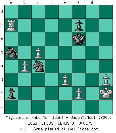 Last move : 0-1 2013 June 6 19:18:46 [Event "FICGS__CHESS__CLASS_B__000173"] [Site "FICGS"] [Date "2012.05.03"] [Round "1"] [White "Migliorini,Roberto"] [Black "Basant,Neel"] [Result "0-1"] [WhiteElo "1856"] [BlackElo "2000"] 1.c4 e5 2.g3 Bc5 3.Nc3 Nf6 4.Bg2 Nc6 5.Nf3 d6 6.O-O Bg4 7.d3 h6 8.Na4 O-O 9.h3 Be6 10.b3 Qd7 11.Kh2 Rfe8 12.Bb2 Bf5 13.e3 Bb6 14.a3 Qd8 15.d4 a5 16.Nxb6 cxb6 17.Rc1 Be4 18.Re1 Qd7 19.dxe5 dxe5 20.Qxd7 Nxd7 21.Nxe5 Rxe5 22.Bxe5 Bxg2 23.Bxg7 Be4 24.Bxh6 Nce5 25.Red1 Nf3+ 26.Kg2 Nc5 27.g4 Nd4 28.Kh2 Ne2 29.b4 Nb3 30.Rb1 Bxb1 31.Rxb1 a4 32.Rd1 Nc3 33.Rd6 Nb1 34.Rxb6 Nxa3 35.c5 Nc4 36.Rxb7 a3 37.Bg5 Kg7 38.Be7 a2 39.g5 Ra6 40.Bf6+ Rxf6 41.gxf6+ Kxf6 42.Ra7 Nba5 0-1 English Opening Kingside Castling by player White (move 6) Kingside Castling by player Black (move 8) Player Black won this chess game. Follow this game move after move (download)An attack on the wing should be met by play in the center. (Nimzovitch) Frage: Gibt es etwas was Sie mehr lieben als Autobahnen ohne Tempobegrenzungen? - Antwort: Deutsche Frauen ohne Tempobegrenzungen. (Loek van Wely) Bobby Fischer es el mas grande genio de Ajedrez de todos los tiempos. (Alexander Kotov) Les Echecs sont et restent toujours un combat, un combat intégral comme la boxe, la lutte ou un autre sport, et où il doit y avoir un vainqueur et un vaincu. (Joseph Emil Diemer) 98% of all statistics are made up. (Author unknown)