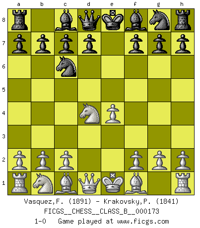 Last move : 1-0 2012 August 22 1:56:54 [Event "FICGS__CHESS__CLASS_B__000173"] [Site "FICGS"] [Date "2012.05.03"] [Round "1"] [White "Vasquez,Fernando"] [Black "Krakovsky,Peter"] [Result "1-0"] [WhiteElo "1891"] [BlackElo "1841"] 1.e4 e5 2.Nf3 Nc6 3.d4 exd4 4.Nxd4 1-0 This chess game has been lost on time (started : 2012.05.03 1:26:16) Scotch game Player White won this chess game. Follow this game move after move (download)Chess is 99 percent tactics. (Teichmann) Nie in meinem Leben habe ich die französische Verteidigung gespielt, welche die Stumpfsinnigste von allen ist. (Wilhelm Steinitz) Evita las multitudes. Haz independientemente tu propio razonamiento. Trata de ser el jugador de Ajedrez, no la pieza de Ajedrez. (Ralph Charell) Je menace de comprendre la position. (Anonyme) The general who wins the battle makes many calculations in his temple before the battle is fought. The general who loses makes but few calculations beforehand. (Sun Tzu)