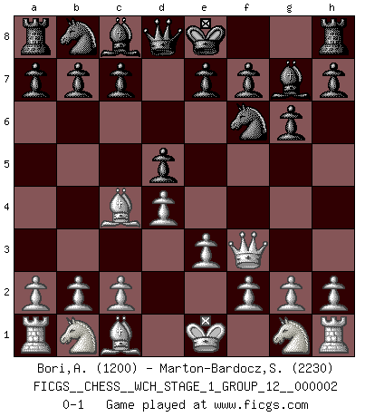 Last move : 0-1 2007 February 22 17:33:6 [Event "FICGS__CHESS__WCH_STAGE_1_GROUP_12__000002"] [Site "FICGS"] [Date "2007.01.16"] [Round "1"] [White "Bori,Aliyu"] [Black "Marton-Bardocz,Sandor"] [Result "0-1"] [WhiteElo "1200"] [BlackElo "2230"] 1.d4 Nf6 2.e3 g6 3.Bc4 Bg7 4.Qf3 d5 0-1 This chess game has been lost on time (started : 2007.01.16 15:23:38) Queen's pawn game Player Black won this chess game. Follow this game move after move (download)Chess is a terrific way for kids to build self image and self esteem. (Saudin Robovic) Das Blackmar-Diemer-Gambit verändert den ganzen Menschen! (Emil Joseph Diemer) Evita las multitudes. Haz independientemente tu propio razonamiento. Trata de ser el jugador de Ajedrez, no la pieza de Ajedrez. (Ralph Charell) Demandez au pauvre Cg1 ce qu'il en pense. Eduard Gufeld à propos de la variante Saemisch de l'Est-Indienne. Horse racing is animated roulette. (Roger Kahn)