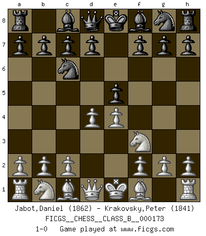 Last move : 1-0 2012 August 14 13:17:20 [Event "FICGS__CHESS__CLASS_B__000173"] [Site "FICGS"] [Date "2012.05.03"] [Round "1"] [White "Jabot,Daniel"] [Black "Krakovsky,Peter"] [Result "1-0"] [WhiteElo "1862"] [BlackElo "1841"] 1.e4 e5 2.Nf3 Nc6 3.d4 1-0 This chess game has been lost on time (started : 2012.05.03 1:26:16) Scotch Opening Player White won this chess game. Follow this game move after move (download)I'd rather have a Pawn than a finger. (Reuben Fine) Ich habe die besten Aussichten, den ersten Preis zu gewinnen - denn jeder muss gegen Steinitz spielen, nur ich nicht! (Wilhelm Steinitz) Yo creo que el Ajedrez posee una magia que es también una ayuda en la edad avanzada. Una rodilla reumática es olvidada durante una partida de Ajedrez y otros eventos pueden parecer algo sin importancia comparada a una catástrofe en el tablero de Ajedrez. (Vlastimil Hort) L'attaque fait le spectacle, la défense gagne les matchs. (Dicton footballistique) The faster the computer, the slower the brain. (Thibault de Vassal)