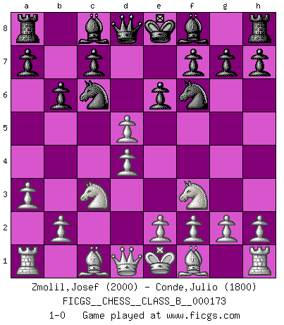 Last move : 1-0 2012 October 8 9:31:59 [Event "FICGS__CHESS__CLASS_B__000173"] [Site "FICGS"] [Date "2012.05.03"] [Round "1"] [White "Zmolil,Josef"] [Black "Conde,Julio"] [Result "1-0"] [WhiteElo "2000"] [BlackElo "1800"] 1.d4 Nf6 2.c4 e6 3.Nc3 d5 4.Nf3 Nc6 5.a3 b6 6.cxd5 1-0 This chess game has been lost on time (started : 2012.05.03 1:26:16) Queen's pawn game Player White won this chess game. Follow this game move after move (download)A sacrifice is best refuted by accepting it. (Wilhelm Steinitz) Modernes Schach sorgt sich zuviel um Dinge wie Bauernstruktur usw. Vergessen Sie das, Schachmatt beendet das Spiel! (Nigel Short) Al jugar al Ajedrez entonces, podemos aprender: Primero: Previsión... Segundo: Prudencia... Tercero: Cautela... Y al final, aprendemos del Ajedrez el hábito de no ser desanimados por apariencias malas presentes en el estado de nuestros asuntos, el hábito de la esperanza por una oportunidad favorable y la perseveración de los secretos de los recursos. (Benjamin Franklin) Ce qui est bien, c'est d'avoir tout un tas de pièces en prise : l'adversaire ne peut en prendre qu'une à la fois. Cité par Thierry Audin. If you have any trouble condescending, find a Unix user to show you how it's done. (Scott Adams)