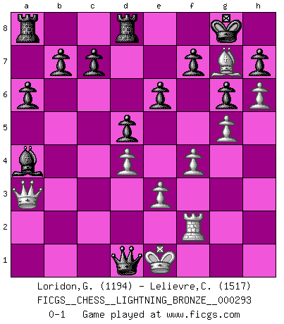 Last move : 0-1 2012 May 3 22:55:58 [Event "FICGS__CHESS__LIGHTNING_BRONZE__000293"] [Site "FICGS"] [Date "2012.05.03"] [Round "1"] [White "Loridon,Geoffroy"] [Black "Lelievre,Clement"] [Result "0-1"] [WhiteElo "1194"] [BlackElo "1517"] 1.d4 d5 2.Nc3 Nf6 3.Nf3 Bf5 4.Bf4 Qd7 5.e3 a6 6.b4 e6 7.a4 Bxb4 8.Nd2 Bxc3 9.Qb1 Bxd2+ 10.Kxd2 Ne4+ 11.Ke1 Qc6 12.h3 Nc3 13.Qb3 O-O 14.g4 Be4 15.Rg1 Nxa4 16.Rxa4 Bxc2 17.Qa3 Bxa4 18.h4 Nd7 19.h5 Nf6 20.h6 g6 21.g5 Ne4 22.Be5 Nd2 23.Bg7 Rfd8 24.f4 Nxf1 25.Rxf1 Qc2 26.Rf2 Qd1+ 0-1 Queen's pawn : Chigorin variation Kingside Castling by player Black (move 13) Player Black won this chess game. Follow this game move after move (download)Methodical thinking is of more use in Chess than inspiration. (C. J. S. Purdy) Schon mancher Spieler hat aufgegeben, um zu vermeiden, daß er eine Figur verliert. (Savielly Grigorievitsch Tartakower) Yo jugué Ajedrez con el y a veces le pude haber ganado solo que siempre devuelve su última jugada y juega la partida de manera diferente. (Mark Twain) C'est la seule position que je connaisse où les deux camps sont mals. Propos prêtés à V. Anand. Do not put your faith in what statistics say until you have carefully considered what they do not say. (William W. Watt)
