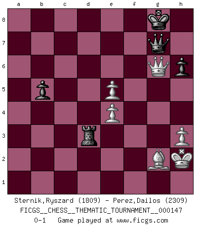 Last move : 0-1 2012 July 30 14:8:10 [Event "FICGS__CHESS__THEMATIC_TOURNAMENT__000147"] [Site "FICGS"] [Date "2012.05.07"] [Round "1"] [White "Sternik,Ryszard"] [Black "Perez,Dailos"] [Result "0-1"] [WhiteElo "1809"] [BlackElo "2309"] 1.c4 d5 2.cxd5 c6 3.dxc6 Nxc6 4.Nf3 e5 5.Nc3 Nf6 6.d3 h6 7.g3 Bc5 8.Bg2 O-O 9.O-O Bg4 10.Bd2 Rc8 11.h3 Be6 12.Rc1 Qd7 13.Kh2 Rfd8 14.Qa4 Qe7 15.Qh4 a6 16.a3 b5 17.b4 Bd6 18.Ne4 Nxe4 19.Qxe4 Qd7 20.Bc3 f5 21.Qe3 f4 22.Qd2 Qe8 23.Qb2 Qh5 24.e3 fxe3 25.fxe3 Bb8 26.Rcd1 Rd7 27.Qb1 Ne7 28.Ba1 Nd5 29.Rde1 Nf6 30.Nd2 Rdc7 31.Rxf6 gxf6 32.Ne4 Qg6 33.Rf1 f5 34.Nc5 Rg7 35.Qe1 Bd6 36.Nxe6 Qxe6 37.Qe2 Bb8 38.e4 f4 39.gxf4 Qb3 40.Rf2 Qxa3 41.Bxe5 Bxe5 42.fxe5 Rd8 43.Rf6 Rxd3 44.Qf2 Qxb4 45.Rxa6 Qe7 46.Qf5 Rg5 47.Rg6+ Rxg6 48.Qxg6+ Qg7 0-1 English Opening Kingside Castling by player Black (move 8) Kingside Castling by player White (move 9) Player Black won this chess game. Follow this game move after move (download)A player surprised is half beaten. (Proverb) Kasparov ist eine Art Monster mit hundert Augen, denen auch nicht das Geringste entgeht. (Tony Miles) Una buena memoria, concentración, imaginación y una fuerte voluntad, se requiere para llegar a ser un buen jugador. (Bobby Fischer) Aucun coup ne doit être joué sans but. (Pedro Damiano) An expert is a man who has made all the mistakes which can be made in a very narrow field. (Niels Bohr)
