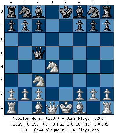 Last move : 1-0 2007 February 22 11:32:42 [Event "FICGS__CHESS__WCH_STAGE_1_GROUP_12__000002"] [Site "FICGS"] [Date "2007.01.16"] [Round "1"] [White "Mueller,Achim"] [Black "Bori,Aliyu"] [Result "1-0"] [WhiteElo "2000"] [BlackElo "1200"] 1.e4 e5 2.Nf3 d5 3.exd5 Qxd5 4.Nc3 Qc5 5.d4 exd4 6.Nxd4 1-0 This chess game has been lost on time (started : 2007.01.16 15:23:38) QP counter-gambit (elephant gambit) Player White won this chess game. Follow this game move after move (download)Chess problems demand from the composer the same virtues that characterize all worthwhile art: originality, invention, conciseness, harmony, complexity, and splendid insincerity. (Vladimir Nabokov) Ich habe Putins Aufstieg an die Macht beobachtet und seine Politik, die demokratischen Institutionen meines Landes zu zerstören. (Garry Kasparov) El Ajedrez expande y enriquece tu mente. (Saudin Robovic) Celui qui prend des risques peut perdre, celui qui n'en prend pas perd toujours. (Xavier Tartacover) If you are going through hell, keep going. (Winston Churchill)