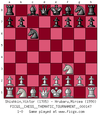 Last move : 1-0 2012 July 30 20:16:37 [Event "FICGS__CHESS__THEMATIC_TOURNAMENT__000147"] [Site "FICGS"] [Date "2012.05.07"] [Round "1"] [White "Shishkin,Viktor"] [Black "Hrubaru,Mircea"] [Result "1-0"] [WhiteElo "1705"] [BlackElo "1990"] 1.c4 d5 2.cxd5 c6 3.dxc6 Nxc6 4.Nf3 1-0 English Opening Player White won this chess game. Follow this game move after move (download)Chess is a more highly symbolic game, but the aggressions are therefore even more frankly represented in the play. It probably began as a war game; that is, the representation of a miniature battle between the forces of two kingdoms. (Karl Meninger) Ja, jede Frau in Holland liebt mich bestimmt, und alle Männer hassen mich. (Loek van Wely) Después de una mala apertura, hay una esperanza en el juego medio. Pero una vez que estas en finales, el momento de la verdad ha llegado. (Edmar Mednis) 'L'échange des dames est un coup dur pour les deux adversaires...' Un journaliste lors d'une partie du match Spassky-Fischer The only difference between a tax man and a taxidermist is that the taxidermist leaves the skin. (Mark Twain)