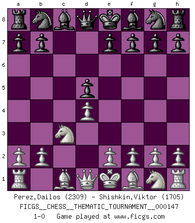 Last move : 1-0 2012 August 18 13:38:3 [Event "FICGS__CHESS__THEMATIC_TOURNAMENT__000147"] [Site "FICGS"] [Date "2012.05.07"] [Round "1"] [White "Perez,Dailos"] [Black "Shishkin,Viktor"] [Result "1-0"] [WhiteElo "2309"] [BlackElo "1705"] 1.c4 d5 2.cxd5 c6 3.d4 cxd5 4.Nc3 1-0 This chess game has been lost on time (started : 2012.05.07 19:52:13) English Opening Player White won this chess game. Follow this game move after move (download)Life is a kind of Chess, with struggle, competition, good and ill events. (Benjamin Franklin) Ein unbeabsichtigtes Patt ist der Gipfel der Dummheit. (Anonymous) Cuando la partida de Ajedrez termina, el Peón y el Rey regresan a la misma caja. (Irish saying) Les Echecs ne sont pas pour les âmes timides. Ils requièrent un homme entier, qui ne s'arrête pas aveuglément à ce qui a été déjà établi, mais qui tente individuellement de sonder les profondeurs du jeu. (W. Steinitz) The Movers & Shakers of this world are those who play chess in the mornings and go to the disco in the evenings. (Dinesh De Silva)
