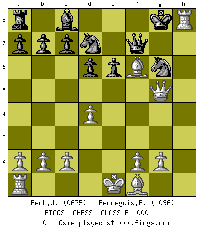 Last move : 1-0 2012 October 10 23:19:45 [Event "FICGS__CHESS__CLASS_F__000111"] [Site "FICGS"] [Date "2012.05.08"] [Round "1"] [White "Pech,Jaroslav"] [Black "Benreguia,Frederic"] [Result "1-0"] [WhiteElo "0675"] [BlackElo "1096"] 1.e4 e6 2.d4 g6 3.Nc3 Bg7 4.Bf4 Ne7 5.Nf3 d6 6.h4 O-O 7.h5 f5 8.Qd2 fxe4 9.Nxe4 Rf7 10.hxg6 Nxg6 11.Be3 Qe7 12.Nfg5 Rf8 13.Nxh7 Rf7 14.Bg5 Qe8 15.Nhf6+ Bxf6 16.Nxf6+ Rxf6 17.Bxf6 Qf7 18.Qg5 Nd7 19.Rh8+ 1-0 French defense Kingside Castling by player Black (move 6) Player White won this chess game. Follow this game move after move (download)The defensive power of a pinned piece is only imaginary. (Aaron Nimzovich) Ich bin Weltmeister und muß mit niemandem irgend etwas diskutieren. (Viswanathan Anand) El Ajedrez es un terrible juego. Si no controlas el centro, tu oponente tiene una posición mas holgada. Si tienes control del centro, ¡entonces realmente tu tienes algo de que preocuparte!. (Siegbert Tarrasch) Ce n'est pas pour s'amuser qu'il joue aux échecs : il célèbre un culte. (Vladimir Nabokov) You cannot beat a roulette table unless you steal money from it. (Albert Einstein)