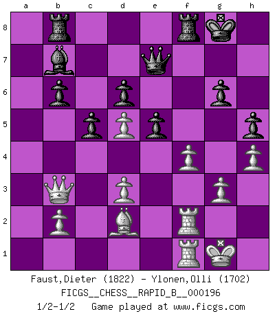 Last move : 1/2-1/2 2012 September 28 8:52:18 [Event "FICGS__CHESS__RAPID_B__000196"] [Site "FICGS"] [Date "2012.05.08"] [Round "1"] [White "Faust,Dieter"] [Black "Ylonen,Olli"] [Result "1/2-1/2"] [WhiteElo "1822"] [BlackElo "1702"] 1.e4 c5 2.Nc3 Nc6 3.Nge2 e5 4.g3 g6 5.d3 Bg7 6.Bg2 d6 7.h4 h5 8.Nd5 Nge7 9.Bg5 Qa5+ 10.Nec3 Nxd5 11.exd5 Nd4 12.O-O f6 13.Bd2 Qa6 14.Ne4 Bg4 15.f3 Bd7 16.Rf2 O-O 17.c3 Nf5 18.Bf1 Qb6 19.Qb3 Qc7 20.a4 b6 21.Bh3 Nd4 22.cxd4 Bxh3 23.dxe5 fxe5 24.a5 Rab8 25.axb6 axb6 26.Ra3 Bc8 27.Ng5 Qe7 28.Ra1 Bb7 29.Ne6 Rfe8 30.Nxg7 Kxg7 31.f4 Rf8 32.Raf1 Kg8 1/2-1/2 Sicilian : chameleon variation Kingside Castling by player White (move 12) Kingside Castling by player Black (move 16) This chess game ended in a draw. Follow this game move after move (download)We must make sure that Chess will not be like a dead language, very interesting, but for a very small group. (Sytze Faber) Schach ist mein Leben, meine Leidenschaft, was ich gelernt habe und seit meinem 14. Lebensjahr profimässig praktiziere. Darauf zu verzichten, würde mir sehr schwer fallen. (Viktor Kortschnoi) El juego de Damas es para vagabundos. (Paul Morphy) Des points faibles ou des trous dans la position de l'adversaire doivent être occupés par des pièces et non pas par des pions. (Siegbert Tarrasch) As a goal marker shodan is important. As a destination it is a poor place to stop. (Thomas Tamayo)