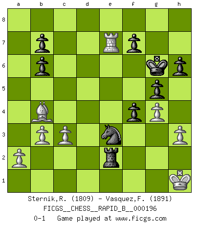 Last move : 0-1 2012 September 24 17:27:57 [Event "FICGS__CHESS__RAPID_B__000196"] [Site "FICGS"] [Date "2012.05.08"] [Round "1"] [White "Sternik,Ryszard"] [Black "Vasquez,Fernando"] [Result "0-1"] [WhiteElo "1809"] [BlackElo "1891"] 1.e4 e5 2.f4 exf4 3.Nf3 d6 4.d4 g5 5.h3 h6 6.Bd3 Ne7 7.O-O Bg7 8.c3 c5 9.Nbd2 cxd4 10.Nxd4 Nbc6 11.N2f3 Qb6 12.Kh2 O-O 13.Bc2 Bd7 14.Qd2 Nxd4 15.Nxd4 Rfe8 16.b3 d5 17.Bb2 Rad8 18.Rae1 dxe4 19.Bxe4 Bb5 20.Rf3 Bc6 21.Rd3 Bxd4 22.Rxd4 Bxe4 23.R1xe4 Nf5 24.Rd7 Ne3 25.Qd4 Nf1+ 26.Kg1 Ng3 27.Qxb6 axb6 28.Rxd8 Rxd8 29.Re1 Rd2 30.Ba3 Nf5 31.Re8+ Kh7 32.Bb4 Ne3 33.g4 Rg2+ 34.Kh1 Re2 35.Re7 Kg6 0-1 KGA : Fischer defense Kingside Castling by player White (move 7) Kingside Castling by player Black (move 12) Player Black won this chess game. Follow this game move after move (download)The Pin is mightier than the sword. (Fred Reinfeld) Das Schach hält seine Meister in eigenen Banden, Fesseln; auf vielerlei Weise formt es ihren Geist, so dass die innere Freiheit selbst des Stärksten beeinflusst wird. (Albert Einstein) Solo puedes ser bueno en el Ajedrez si amas al juego. (Bobby Fischer) Assurément je connaissais par expérience le mystérieux attrait de ce jeu royal, le seul entre tous les jeux inventés par les hommes qui échappe souverainement à la tyrannie du hasard, le seul où l'on ne doive sa victoire qu'à son intelligence ou plutôt à une certaine forme d'intelligence. Mais n'est-ce pas déjà le limiter injurieusement que d'appeler les échecs un jeu ? N'est-ce pas une science, un art ou quelque chose qui, comme le cercueil de Mahomet entre ciel et terre, est suspendu entre l'un et l'autre, et qui réunit un nombre incroyable de contraires ? [...] C'est une pensée qui ne mène à rien, une mathématique qui n'établit rien, un art qui ne laisse pas d'uvre, une architecture sans matière; et il l'a prouvé néanmoins qu'il était plus durable, à sa manière, que les livres ou que tout autre monument, ce jeu unique qui appartient à tous les peuples et à tous les temps, et dont personne ne sait quel dieu en fit don à la terre pour tuer l'ennui, pour aiguiser l'esprit et stimuler l'âme. Où commence-t-il, où finit-il ? (Stefan Zweig) Perseverance does not equal worthiness. Next time you want to get my attention, wear something fun. Low-riding jeans are hot. (Gregory House, House M.D.)