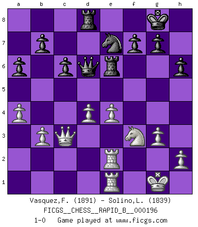 Last move : 1-0 2012 November 11 10:29:4 [Event "FICGS__CHESS__RAPID_B__000196"] [Site "FICGS"] [Date "2012.05.08"] [Round "1"] [White "Vasquez,Fernando"] [Black "Solino,Leonardo"] [Result "1-0"] [WhiteElo "1891"] [BlackElo "1839"] 1.e4 e5 2.Nf3 Nc6 3.d4 exd4 4.Nxd4 Bc5 5.Be3 Qf6 6.c3 Nge7 7.Bc4 Ne5 8.Be2 Qg6 9.O-O d6 10.f3 O-O 11.Nd2 d5 12.Kh1 dxe4 13.fxe4 Bg4 14.Bf4 Bxe2 15.Qxe2 Bd6 16.Bxe5 Bxe5 17.N2f3 Bxd4 18.cxd4 c6 19.Rae1 Rad8 20.Qc2 Qe6 21.Qc5 Nc8 22.b3 Qe7 23.Qc3 h6 24.a4 Rfe8 25.Rf2 Qd6 26.Rd2 a6 27.Kg1 Re6 28.Rde2 Ne7 29.g3 1-0 This chess game has been lost on time (started : 2012.05.08 22:4:14) Scotch game Kingside Castling by player White (move 9) Kingside Castling by player Black (move 10) Player White won this chess game. Follow this game move after move (download)Pawn endings are to Chess what putting is to golf. (Cecil Purdy) Sicherlich können nur Meister einen Stil haben. Daß ein nicht-Meister auch nur ein einziges Mal in seinem Leben eine Partie folgerecht durchführte, habe ich niemals bemerkt. (Emanuel Lasker) Repentinamente, me resultaba obvio en mi analisis que yo había pasado por alto lo que Fischer había visto en el tablero con la mas grande facilidad. (Mikhail Botvinnik) Psychologiquement, tu dois avoir confiance en toi même, mais cette confiance doit être basée sur des faits. (Robert Fischer) In every real man a child is hidden that wants to play. (Friedrich Nietzsche)