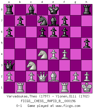 Last move : 0-1 2012 August 28 3:46:58 [Event "FICGS__CHESS__RAPID_B__000196"] [Site "FICGS"] [Date "2012.05.08"] [Round "1"] [White "Varvadoukas,Theo"] [Black "Ylonen,Olli"] [Result "0-1"] [WhiteElo "1797"] [BlackElo "1702"] 1.e4 c5 2.Nf3 d6 3.d4 cxd4 4.Nxd4 Nf6 5.Nc3 a6 6.Bg5 e6 7.f4 Qb6 8.Qd2 Qxb2 9.Rb1 Qa3 10.Bxf6 gxf6 11.Be2 h5 12.O-O Nd7 13.Kh1 Be7 0-1 This chess game has been lost on time (started : 2012.05.08 22:4:14) Sicilian : Najdorf, 7...Qb6 Kingside Castling by player White (move 12) Player Black won this chess game. Follow this game move after move (download)A player surprised is half beaten. (Proverb) Vom Schach wurde gesagt das Leben sei dafür nicht lange genug. Aber das ist der Fehler des Lebens, nicht des Schach'. (Irving Chernev) Los Peones son nacidos libres, y aún así, se encuentran encadenados por todos lados. (Rick Kennedy) On entre au jeu d'Echecs comme on entre en Religion. Pour le joueur d'Echecs, la partie d'Echecs c'est l'office, la messe, le défilé du 1er Mai, le dépôt de gerbe au Monument aux Morts. C'est un drame sacré. (Michel Roos) Don't be irreplaceable, if you can't be replaced, you can't be promoted. (Dan Rotaru)