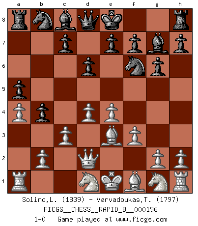 Last move : 1-0 2012 August 29 3:53:48 [Event "FICGS__CHESS__RAPID_B__000196"] [Site "FICGS"] [Date "2012.05.08"] [Round "1"] [White "Solino,Leonardo"] [Black "Varvadoukas,Theo"] [Result "1-0"] [WhiteElo "1839"] [BlackElo "1797"] 1.e4 d6 2.d4 g6 3.Nc3 Bg7 4.Be3 a6 5.Qd2 b5 6.a4 b4 7.Nd1 a5 8.c3 Nf6 9.f3 1-0 This chess game has been lost on time (started : 2012.05.08 22:4:14) King's pawn Opening Player White won this chess game. Follow this game move after move (download)A win by an unsound combination, however showy, fills me with artistic horror. (Wilhelm Steinitz) Kritik überlasse ich den Spießern. Ich zeige nichts, wofür ich mich schämen muss. (Alexandra Kosteniuk) El Ajedrez es una manera fabulosa para que los niños aprendan a autovalorarse y a autoestimarse. (Saudin Robovic) En blitz, le Cavalier l'emporte sur le Fou. (Vlastimil Hort) 'preceded by its own quotation yields a falsehood' preceded by its own quotation yields a falsehood. (W. V. O. Quine - Set Theory And Its Logic, 1953)