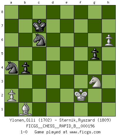 Last move : 1-0 2012 November 28 13:46:40 [Event "FICGS__CHESS__RAPID_B__000196"] [Site "FICGS"] [Date "2012.05.08"] [Round "1"] [White "Ylonen,Olli"] [Black "Sternik,Ryszard"] [Result "1-0"] [WhiteElo "1702"] [BlackElo "1809"] 1.e4 e5 2.Nf3 Nc6 3.Bb5 a6 4.Ba4 Nf6 5.O-O Be7 6.Re1 b5 7.Bb3 O-O 8.c3 d6 9.h3 Na5 10.Bc2 c5 11.d4 Qc7 12.Nbd2 Re8 13.Nf1 Bd7 14.b3 Rac8 15.Ne3 cxd4 16.cxd4 Nc6 17.Bb2 Bf8 18.Rc1 Qb7 19.dxe5 Nxe5 20.Nd2 Bc6 21.Nf5 g6 22.Nd4 Bh6 23.Nxc6 Rxc6 24.Bb1 Rxc1 25.Bxc1 Qe7 26.Nf1 Bxc1 27.Qxc1 Nh5 28.Rd1 Qh4 29.Qh6 Rd8 30.Ng3 Qf4 31.Qxf4 Nxf4 32.Kf1 b4 33.Ne2 Ne6 34.f4 Nc6 35.Kf2 Kf8 36.g4 h6 37.Rc1 Nc5 38.e5 Ke7 39.h4 Kd7 40.exd6 Kxd6 41.Rh1 Rg8 42.h5 g5 43.Ng3 Ne7 44.Rd1+ Kc7 45.Rd4 a5 46.fxg5 Rxg5 47.Rc4 Kb6 48.Rf4 Nc6 49.Rxf7 a4 50.bxa4 Nxa4 51.Rf6 Kc7 52.Rg6 Ra5 53.g5 Rxg5 54.Rxg5 hxg5 55.h6 1-0 Ruy Lopez : Closed, 7...O-O Kingside Castling by player White (move 5) Kingside Castling by player Black (move 7) 10 pieces endgame at move 54 : White KBNPP , Black KNNPP WHITE : King + 1 Bishop 1 Knight 2 Pawns BLACK : King + 2 Knights 2 Pawns Player White won this chess game. Follow this game move after move (download)You know you're going to lose. Even when I was ahead I knew I was going to lose. - On playing against Fischer. (Andrew Soltis) Mein Gehirn das ist mein zweitwichtigstes Organ [Aus dem Film: Der Schläfer]. (Woody Allen) Nada excita más a Grandes Maestros aburridos que una novedad teórica. (Dominic Lawson) Comme les marins qui ont mille raisons différentes d'aller en mer, les joueurs d'échecs en ont tout autant avant de s'installer devant une table et jouer... (Vincent Bertignac, philosophe) He is a liar. I just don't know what the lie is yet. (Horatio Caine, C.S.I. Miami)