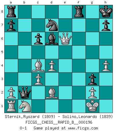Last move : 0-1 2012 August 26 22:9:45 [Event "FICGS__CHESS__RAPID_B__000196"] [Site "FICGS"] [Date "2012.05.08"] [Round "1"] [White "Sternik,Ryszard"] [Black "Solino,Leonardo"] [Result "0-1"] [WhiteElo "1809"] [BlackElo "1839"] 1.e4 e5 2.f4 exf4 3.Nf3 g5 4.h4 g4 5.Ne5 Nf6 6.Bc4 d5 7.exd5 Bd6 8.d4 Nh5 9.Bb5+ c6 10.dxc6 bxc6 11.Bc4 O-O 12.Nxg4 Ng3 13.Rh3 Qe7+ 14.Kf2 Kh8 15.Qf3 Re8 16.Bd2 Bxg4 17.Qxg4 Qe4 18.c3 Qc2 19.Rxg3 fxg3+ 20.Kg1 f5 21.Qf3 Qxb2 22.Qxf5 Rf8 23.Qe6 Nd7 0-1 KGA : Kieseritsky, Berlin defense, 6.Bc4 Kingside Castling by player Black (move 11) Player Black won this chess game. Follow this game move after move (download)In order to improve your game, you must study the endgame before everything else, for whereas the endings can be studied and mastered by themselves, the middle game and the opening must be studied in relation to the endgame. (Jose Raul Capablanca) Ich weiss nicht was Gott gegen mich auf 1.e4 antworten würde. (Robert James Fischer) Debió haber existido una vez en que los hombres eran semidióses, de otra manera no hubiesen podido inventar el Ajedrez. (Gustav Schenk) Si le désir cupide (et stupide) de gagner est une inépuisable source de souffrance, une combinaison brillante sur l'échiquier est une découverte : le coquelicot qui s'épanouit lorsque apparaît la Voie Lactée. (Arrabal) There is no vagueness without wind. (Chinese proverb)