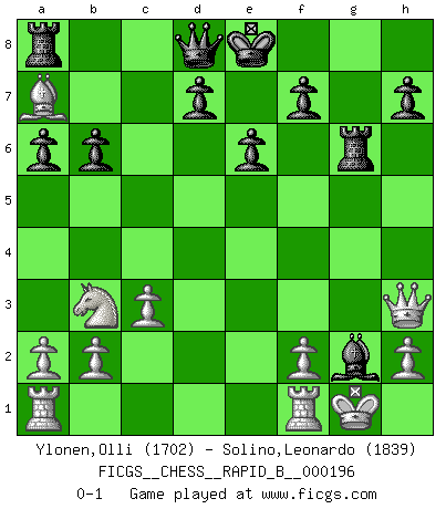 Last move : 0-1 2012 September 21 16:26:49 [Event "FICGS__CHESS__RAPID_B__000196"] [Site "FICGS"] [Date "2012.05.08"] [Round "1"] [White "Ylonen,Olli"] [Black "Solino,Leonardo"] [Result "0-1"] [WhiteElo "1702"] [BlackElo "1839"] 1.e4 c5 2.Nf3 e6 3.d4 cxd4 4.Nxd4 a6 5.Bd3 Bc5 6.Nb3 Ba7 7.O-O Nc6 8.Qg4 Nf6 9.Qxg7 Rg8 10.Qh6 Ne5 11.Be2 Neg4 12.Bxg4 Rg6 13.Qh4 Rxg4 14.Qh3 Rg6 15.Be3 Nxe4 16.Bxa7 b6 17.N1d2 Bb7 18.Nxe4 Bxe4 19.c3 Bxg2 0-1 Sicilian : Kan, Polugaievsky variation Kingside Castling by player White (move 7) Player Black won this chess game. Follow this game move after move (download)The essence of Chess is thinking about what Chess is. (David Bronstein) Herr Iljumschinow ist ein etwas merkwürdiger Geschäftsmann: Er arbeitet zusammen mit Leuten wie Muammar al-Gaddafi; früher ist das Saddam Hussein gewesen. (Joel Lautier) Todo se encuentra en un estado de flujo y esto incluye al mundo del Ajedrez. (Mikhail Botvinnik) Roi des jeux et jeu des rois, les échecs portent en eux un sentiment d'infini. Ils donnent à celui qui s'est efforcé d'en approfondir les arcanes l'impression de n'être pas à la mesure de l'homme; en fait, ils constituent un résumé de l'univers, un microcosme, et figurent cette grande échelle qui, dans les plans de la lumière descend jusqu'à la matière, qui des abîmes insondables remonte jusqu'en l'infini de Dieu. (Pyrame) There are two kinds of tragedy in this world, one is not getting what you want and the other is getting. (Lord of war)