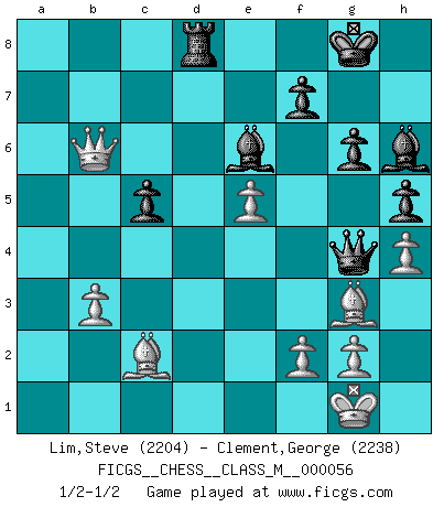 Last move : 1/2-1/2 2012 September 18 12:30:25 [Event "FICGS__CHESS__CLASS_M__000056"] [Site "FICGS"] [Date "2012.05.09"] [Round "1"] [White "Lim,Steve"] [Black "Clement,George"] [Result "1/2-1/2"] [WhiteElo "2204"] [BlackElo "2238"] 1.e4 e5 2.Nf3 Nc6 3.Bb5 a6 4.Ba4 Nf6 5.O-O Be7 6.Re1 b5 7.Bb3 d6 8.c3 O-O 9.h3 Bb7 10.d4 Re8 11.Nbd2 Bf8 12.Bc2 h6 13.a3 d5 14.dxe5 Nxe5 15.Nxe5 Rxe5 16.Nf3 Re8 17.e5 Ne4 18.Bf4 c5 19.a4 Bc6 20.Nd2 Nxd2 21.Qxd2 Qd7 22.axb5 axb5 23.Rxa8 Bxa8 24.Re3 g6 25.Rg3 Qe6 26.h4 h5 27.Qe2 Bg7 28.Qxb5 Rc8 29.Re3 Bc6 30.Qb6 d4 31.cxd4 Qg4 32.d5 Bxd5 33.Bg3 Bh6 34.Rd3 Be6 35.b3 Ra8 36.Rd8+ Rxd8 1/2-1/2 Ruy Lopez : Closed Kingside Castling by player White (move 5) Kingside Castling by player Black (move 8) This chess game ended in a draw. Follow this game move after move (download)Weak points or holes in the opponent's position must be occupied by pieces not Pawns. (Siegbert Tarrasch) Ein Schachspiel besteht aus drei Phasen: Die erste, wenn du hofftst den Vorteil zu haben, die zweite, wenn du glaubst einen Vorteil zu haben, und die dritte.... wenn du weißt Du wirst verlieren. (Savielly Grigorievitsch Tartakower) Muchos se han convertido en Maestros de Ajedrez, nadie se ha convertido en el Maestro del Ajedrez. (Siegbert Tarrasch) La conception d'un plan est le processus par lequel un joueur exploite les avantages de sa position tout en s'efforçant d'en réduire au minimum les inconvénients. Afin de garantir le succès, un plan doit toujours se fonder sur un diagnostic objectif des particularités d'une position. La conception d'un plan est d'autant plus difficile que la position est équilibrée, et grandement facilitée lorsqu'il n'existe qu'un seul plan susceptible de répondre aux exigences de la position. (Harry Golombek) The real danger is not that computers will begin to think like men, but that men will begin to think like computers. (Sydney J. Harris)