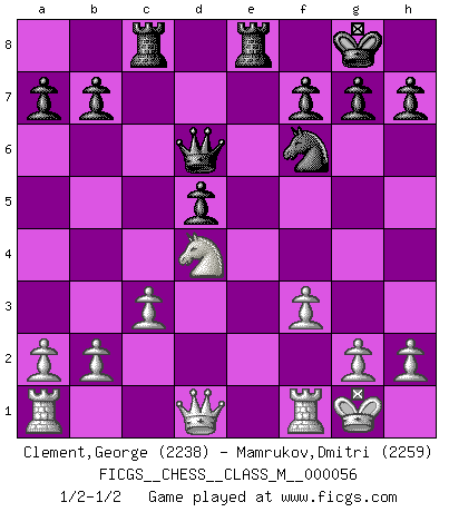 Last move : 1/2-1/2 2012 May 31 17:59:12 [Event "FICGS__CHESS__CLASS_M__000056"] [Site "FICGS"] [Date "2012.05.09"] [Round "1"] [White "Clement,George"] [Black "Mamrukov,Dmitri"] [Result "1/2-1/2"] [WhiteElo "2238"] [BlackElo "2259"] 1.e4 e6 2.d4 d5 3.Nd2 c5 4.Ngf3 Nf6 5.exd5 exd5 6.Bb5+ Bd7 7.Bxd7+ Nbxd7 8.O-O Be7 9.dxc5 Nxc5 10.Nb3 Nce4 11.Nbd4 O-O 12.Nf5 Re8 13.Nxe7+ Qxe7 14.c3 Qc7 15.Nd4 Rac8 16.f3 Nd6 17.Bf4 Qc5 18.Bxd6 Qxd6 1/2-1/2 French : Tarrasch, Open variation Kingside Castling by player White (move 8) Kingside Castling by player Black (move 11) This chess game ended in a draw. Follow this game move after move (download)I won't play with you anymore. You have insulted my friend. - When an opponent cursed himself for a blunder. (Miguel Najdorf) Nach Morphy wurde nichts neues mehr in der Behandlung offener Positionen gefunden. (Mikhail Moiseyevich Botvinik) Aún el Rey más flojo huye despavorido ante la amenaza de un Jaque doble. (Aaron Nimzowitsch) Il s'avisa de me proposer d'apprendre les échecs qu'il jouait un peu... me voilà forcené des échecs. J'achète un échiquier, je m'enferme dans ma chambre, j'y passe des jours et des nuits à vouloir apprendre par cœur toutes les parties. (Jean-Jacques Rousseau, Confessions) Empty your mind, be formless, shapeless — like water. (Bruce Lee)