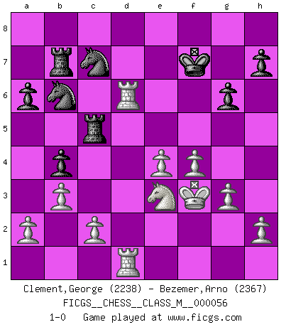 Last move : 1-0 2013 March 22 18:35:44 [Event "FICGS__CHESS__CLASS_M__000056"] [Site "FICGS"] [Date "2012.05.09"] [Round "1"] [White "Clement,George"] [Black "Bezemer,Arno"] [Result "1-0"] [WhiteElo "2238"] [BlackElo "2367"] 1.e4 c5 2.Nf3 d6 3.d4 cxd4 4.Nxd4 Nf6 5.Nc3 a6 6.Be2 Nbd7 7.O-O e6 8.Qd3 b6 9.Qg3 Bb7 10.f3 g6 11.Rd1 Be7 12.Bh6 Nh5 13.Qh3 Bg5 14.Bxg5 Qxg5 15.Nxe6 fxe6 16.Qxe6+ Qe7 17.Qxd6 Qxd6 18.Rxd6 Ke7 19.Rad1 Rhd8 20.Bc4 Ng7 21.R6d2 b5 22.Bd5 Rdb8 23.Bxb7 Rxb7 24.Nd5+ Kf7 25.Ne3 Nb6 26.b3 Rc8 27.Kf2 Ne6 28.Rd6 Rc5 29.g3 b4 30.f4 Nc7 31.Kf3 1-0 This chess game has been lost on time (started : 2012.05.09 2:16:12) Sicilian : Najdorf, Opovcensky variation Kingside Castling by player White (move 7) Player White won this chess game. Follow this game move after move (download)Blessed be the memory of him who gave the world this immortal game. (A. G. Gardiner) Der Schachmeister von Heute braucht Courage, einen Killerinstinkt, Ausdauer und Arroganz. (Larry Evans) De todos mis libros Rusos, la defensa contiene y difunde el 'calor' mas grande que pudiese verse extraño al observar lo supremamente abstracto que el Ajedrez supuestamente es. (Vladimir Nabokov) Il a essayé de se convaincre qu'il pourrait empêcher toutes les erreurs et ne jamais perdre. L'horreur ! Gary Kasparov au sujet de Robert Fischer. Warrior pose battles inner weakness and wins focus. You see that there is no war within you. You're on your own side, and you are your own strength. (Terri Guillemets)