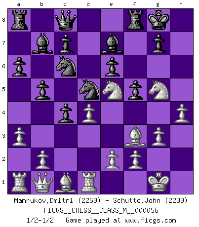 Last move : 1/2-1/2 2012 July 30 14:19:36 [Event "FICGS__CHESS__CLASS_M__000056"] [Site "FICGS"] [Date "2012.05.09"] [Round "1"] [White "Mamrukov,Dmitri"] [Black "Schutte,John"] [Result "1/2-1/2"] [WhiteElo "2259"] [BlackElo "2239"] 1.d4 d5 2.c4 e6 3.Nf3 Nf6 4.g3 dxc4 5.Bg2 a6 6.Ne5 Bb4+ 7.Nc3 Nd5 8.O-O O-O 9.Qc2 b5 10.Be4 Bb7 11.Bxh7+ Kh8 12.Be4 Nc6 13.Rd1 Be7 14.Bf3 Ndb4 15.Qb1 Qc8 16.Ne4 Kg8 17.a3 Nd5 18.h4 f5 19.Ng5 1/2-1/2 Queen's gambit declined Kingside Castling by player White (move 8) Kingside Castling by player Black (move 8) This chess game ended in a draw. Follow this game move after move (download)Modern Chess is too much concerned with things like Pawn structure. Forget it, Checkmate ends the game. (Nigel Short) Wenn Schach ein enormer Dschungel ist, der seine Myriaden von Geheimnissen nicht preisgeben will, dann sind Computer die Kettensägen einer gewaltigen ökologisch unsensiblen Nutzholzfirma. (Nigel Short) No es una movida, aún la mejor movida que tu debas buscar, sino un plan comprensible. (Eugene Znosko-Borovsky) Les Echecs représentent une sphère d'idées créatrices basée sur la volonté des deux protagonistes. (Smyslov) Luck never gives; it only lends. (Swedish proverb)