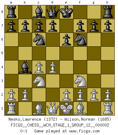Last move : 0-1 2007 February 21 23:24:28 [Event "FICGS__CHESS__WCH_STAGE_1_GROUP_12__000002"] [Site "FICGS"] [Date "2007.01.16"] [Round "1"] [White "Nesko,Lawrence"] [Black "Wilson,Norman"] [Result "0-1"] [WhiteElo "1372"] [BlackElo "1685"] 1.d4 Nf6 2.c4 e6 3.Nf3 Nc6 4.Nc3 Bb4 0-1 This chess game has been lost on time (started : 2007.01.16 15:23:38) Queen's pawn game Player Black won this chess game. Follow this game move after move (download)There are two classes of men; those who are content to yield to circumstances and who play whist; those who aim to control circumstances, and who play Chess. (Mortimer Collins) Strategie ist, wie man ein Mädchen auf den Rücksitz bekommt. Taktik ist, was man tut, wenn man dann dort ist. (Anonymous) La señal de un Gran Maestro es su habilidad de ganar una partida rápidamente y sin dolor. (Irving Chernev) Les sacrifices démontrent seulement que quelqu'un a gaffé. (Savielly Tartacover) Those who make the worst use of their time are the first to complain of its brevity. (Jean de la Bruyere)
