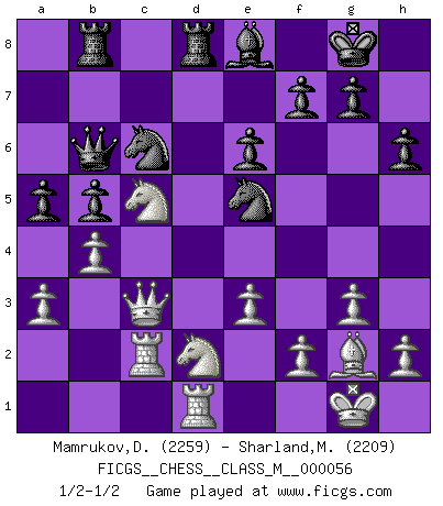 Last move : 1/2-1/2 2012 October 22 17:14:16 [Event "FICGS__CHESS__CLASS_M__000056"] [Site "FICGS"] [Date "2012.05.09"] [Round "1"] [White "Mamrukov,Dmitri"] [Black "Sharland,Michael"] [Result "1/2-1/2"] [WhiteElo "2259"] [BlackElo "2209"] 1.d4 Nf6 2.c4 e6 3.Nf3 d5 4.g3 Be7 5.Bg2 O-O 6.O-O dxc4 7.Ne5 c5 8.dxc5 Qc7 9.Nxc4 Qxc5 10.b3 Rd8 11.Nbd2 Qc7 12.Bb2 Nc6 13.Rc1 Bd7 14.a3 Be8 15.b4 Rac8 16.e3 b5 17.Na5 Qb6 18.Nab3 Nd7 19.Qc2 Qa6 20.Qe4 Bf6 21.Qb1 Bxb2 22.Qxb2 Nde5 23.Nc5 Qb6 24.Rfd1 h6 25.Qa1 Rb8 26.Qc3 a5 27.Rc2 1/2-1/2 Queen's pawn game Kingside Castling by player Black (move 5) Kingside Castling by player White (move 6) This chess game ended in a draw. Follow this game move after move (download)As one by one I mowed them down, my superiority soon became apparent. (Jose Capablanca) Ein Buch ist ein Spiegel; wenn ein Affe hineinsieht, so kann kein Apostel heraus gucken. (Georg Christoph Lichtenberg) Un Peón pasado aumenta su poder a medida de que el número de piezas en el tablero disminuye. (Capablanca) Les échecs sont un jeu terrible. Si vous n'avez pas le centre, votre adversaire a une position plus libre. Par contre, si vous avez le centre, alors vous avez vraiment quelque chose pour laquelle vous inquiéter ! (Siegbert Tarrasch) Wisdom is the reward you get for a lifetime of listening when you'd have preferred to talk. (Doug Larson)
