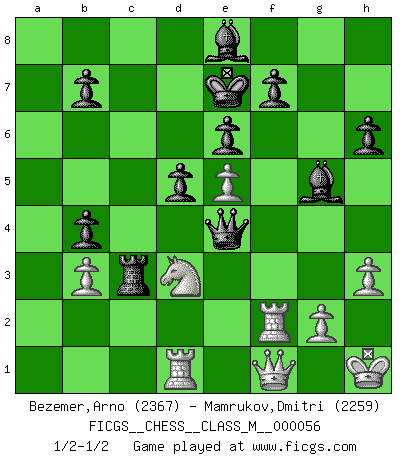 Last move : 1/2-1/2 2012 December 23 11:40:50 [Event "FICGS__CHESS__CLASS_M__000056"] [Site "FICGS"] [Date "2012.05.09"] [Round "1"] [White "Bezemer,Arno"] [Black "Mamrukov,Dmitri"] [Result "1/2-1/2"] [WhiteElo "2367"] [BlackElo "2259"] 1.e4 e6 2.d4 d5 3.Nd2 c5 4.Ngf3 Nf6 5.e5 Nfd7 6.c3 Nc6 7.Bd3 Be7 8.O-O a5 9.Qe2 cxd4 10.cxd4 Qb6 11.Qe3 g5 12.b4 Nxb4 13.Ba3 h6 14.Bxb4 axb4 15.Nb3 Nb8 16.Ne1 Nc6 17.Nc2 Bd7 18.f4 Rc8 19.Kh1 Nd8 20.Qe2 gxf4 21.Rxf4 Rc3 22.Ne3 Bg5 23.Rf2 Nc6 24.Nd1 Rxb3 25.axb3 Ke7 26.Bb5 Qxd4 27.Bxc6 Bxc6 28.Nb2 Rc8 29.Rd1 Qe4 30.Qf1 Be8 31.Nd3 Rc7 32.h3 Rc3 1/2-1/2 French : Tarrasch, Open variation Kingside Castling by player White (move 8) This chess game ended in a draw. Follow this game move after move (download)In complicated positions, Bobby Fischer hardly had to be afraid of anybody. (Paul Keres) Im Blitz ist es einfacher mit einer Figur weniger anzugreifen, als sich mit einer Mehrfigur zu verteidigen. (Mikhail Nekhemyevich Tal) Aquel que ve no otra dirección en el juego que la de dar Jaque Mate a su oponente, nunca será un buen jugador de Ajedrez. (Euwe) Horreur, mais aussi harmonie suprême : qu'y avait-il en effet au monde en dehors des échecs ? Le brouillard, l'inconnu, le non-être... (Vladimir Nabokov) They say poker is a zero-sum game. It must be, because every time I play my sum ends up zero. (Max Shapiro)