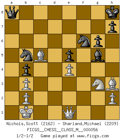Last move : 1/2-1/2 2012 October 10 20:9:2 [Event "FICGS__CHESS__CLASS_M__000056"] [Site "FICGS"] [Date "2012.05.09"] [Round "1"] [White "Nichols,Scott"] [Black "Sharland,Michael"] [Result "1/2-1/2"] [WhiteElo "2162"] [BlackElo "2209"] 1.e4 c5 2.Nf3 d6 3.d4 cxd4 4.Nxd4 Nf6 5.Nc3 a6 6.Be3 e5 7.Nb3 Be6 8.f3 Be7 9.Qd2 O-O 10.O-O-O Nbd7 11.g4 b5 12.g5 b4 13.Ne2 Ne8 14.f4 a5 15.f5 a4 16.fxe6 axb3 17.cxb3 fxe6 18.Bh3 Rxa2 19.Bxe6+ Kh8 20.Ng3 Nc7 21.Bc4 Qa8 22.Rhf1 Rxf1 23.Rxf1 Ra1+ 24.Kc2 Rxf1 25.Bxf1 d5 26.Qf2 g6 27.Kb1 d4 28.Bxd4 Bxg5 29.Bh3 Nb5 30.Bc5 Nf6 31.Qe1 1/2-1/2 Sicilian : Najdorf, Byrne (English) attack Kingside Castling by player Black (move 9) Queenside Castling by player White (move 10) This chess game ended in a draw. Follow this game move after move (download)Fischer prefers to enter Chess history alone. (Miguel Najdorf) Sicherlich können nur Meister einen Stil haben. Daß ein nicht-Meister auch nur ein einziges Mal in seinem Leben eine Partie folgerecht durchführte, habe ich niemals bemerkt. (Emanuel Lasker) El Rey es una pieza de pelea. ¡Usenlo!. (Wilhelm Steinitz) Une platitude souvent récitée à propos des Echecs est qu'une des choses les plus difficiles à réaliser est de gagner une position gagnante. Cela ne manque pas de sens mais, pour ma part, j'ai toujours trouvé plus difficile de gagner une position perdante. (Tim Krabbe) Have no fear of perfection - you'll never reach it. (Salvador Dali)