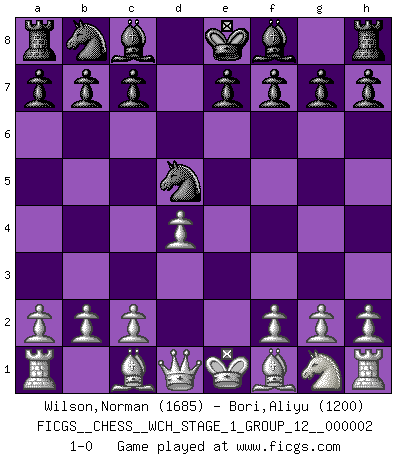Last move : 1-0 2007 February 22 11:32:42 [Event "FICGS__CHESS__WCH_STAGE_1_GROUP_12__000002"] [Site "FICGS"] [Date "2007.01.16"] [Round "1"] [White "Wilson,Norman"] [Black "Bori,Aliyu"] [Result "1-0"] [WhiteElo "1685"] [BlackElo "1200"] 1.e4 d5 2.exd5 Qxd5 3.Nc3 Nf6 4.Nxd5 Nxd5 5.d4 1-0 This chess game has been lost on time (started : 2007.01.16 15:23:38) Scandinavian (centre counter) defense Player White won this chess game. Follow this game move after move (download)No other master has such a terrific will to win. At the board he radiates danger, and even the strongest opponents tend to freeze, like rabbits when they smell a panther. Even his weaknesses are dangerous. As white, his opening game is predictable - you can make plans against it - but so strong that your plans almost never work. In the middle game his precision and invention are fabulous, and in the end game you simply cannot beat him. (Anonymous German Expert) Wenn ein Kopf und ein Buch zusammenstoßen und es klingt hohl, ist es denn allemal im Buche? (Georg Christoph Lichtenberg) Al jugar al Ajedrez entonces, podemos aprender: Primero: Previsión... Segundo: Prudencia... Tercero: Cautela... Y al final, aprendemos del Ajedrez el hábito de no ser desanimados por apariencias malas presentes en el estado de nuestros asuntos, el hábito de la esperanza por una oportunidad favorable y la perseveración de los secretos de los recursos. (Benjamin Franklin) Comme les marins qui ont mille raisons différentes d'aller en mer, les joueurs d'échecs en ont tout autant avant de s'installer devant une table et jouer... (Vincent Bertignac, philosophe) When I took office, only high energy physicists had ever heard of what is called the World Wide Web... Now even my cat has its own page. (Bill Clinton, 1996)
