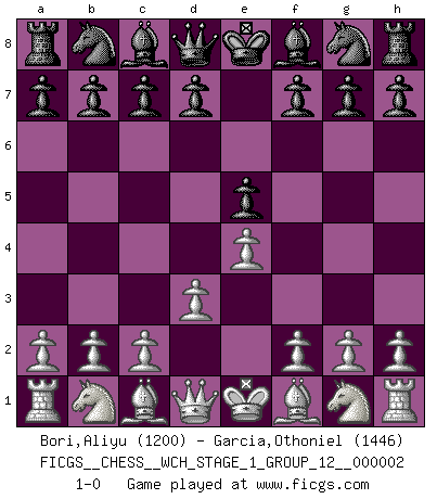 Last move : 1-0 2007 February 24 5:41:26 [Event "FICGS__CHESS__WCH_STAGE_1_GROUP_12__000002"] [Site "FICGS"] [Date "2007.01.16"] [Round "1"] [White "Bori,Aliyu"] [Black "Garcia,Othoniel"] [Result "1-0"] [WhiteElo "1200"] [BlackElo "1446"] 1.d3 e5 2.e4 1-0 This chess game has been lost on time (started : 2007.01.16 15:23:38) Mieses Opening Player White won this chess game. Follow this game move after move (download)You have to have the fighting spirit. You have to force moves and take chances. (Bobby Fischer) Der Knackpunkt bei der Konzentration ist, daß wir nur durch sie etwas Neues und Ungewöhnliches am Schachbrett finden können. Sie ist der einzige Weg durch neue neue Ideen eine Überraschung zu bereiten. (Garry Kasparov) El Ajedrez moderno está demasiado preocupado con cosas como la estructura de Peones. Olvidenlo, el Jaque Mate termina la partida. (Nigel Short) La victoire dans une partie d'Echecs appartient la plupart du temps à celui qui voit un peu plus loin que l'adversaire. (Lasker) Everything in life is luck. (Donald Trump)