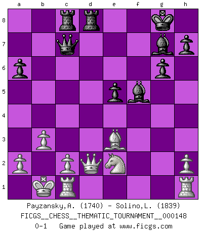 Last move : 0-1 2012 September 16 6:59:10 [Event "FICGS__CHESS__THEMATIC_TOURNAMENT__000148"] [Site "FICGS"] [Date "2012.05.09"] [Round "1"] [White "Payzansky,Aleksey"] [Black "Solino,Leonardo"] [Result "0-1"] [WhiteElo "1740"] [BlackElo "1839"] 1.e4 c5 2.Nf3 d6 3.d4 cxd4 4.Nxd4 Nf6 5.Nc3 g6 6.Be3 Bg7 7.f3 O-O 8.Qd2 Nc6 9.Bc4 Bd7 10.O-O-O Rc8 11.Bb3 Ne5 12.Kb1 Nc4 13.Bxc4 Rxc4 14.g4 b5 15.b3 Rc8 16.Ndxb5 a6 17.Nd4 Qc7 18.Nd5 Nxd5 19.exd5 e6 20.dxe6 fxe6 21.f4 e5 22.fxe5 dxe5 23.Ne2 Bxg4 24.Rde1 Bf5 25.Rc1 Rfd8 0-1 Sicilian : Dragon, Yugoslav attack, 7...O-O Kingside Castling by player Black (move 7) Queenside Castling by player White (move 10) Player Black won this chess game. Follow this game move after move (download)Nothing excites jaded Grandmasters more than a theoretical novelty. (Dominic Lawson) Ich tröste mich mit dem Vergnügen, daß Schachfans, Zuschauer und Leser glücklich sind, wenn ein Großmeister etwas riskiert, statt nur Klötzchen zu schieben. (Mikhail Nekhemyevich Tal) En partidas rápidas, el Caballo es mas poderoso que el Alfil. (Vlastimil Hort) Les échecs sont un jeu par leur forme, un art par leur essence et une science par sa difficulté d'acquisition. Ils peuvent vous procurer autant de plaisir qu'un bon livre ou une belle musique, mais vous n'aurez une réelle joie que si vous arrivez à bien jouer. (Tigran Petrosian) The difference between perseverance and obstinacy is that one comes from a strong will, and the other from a strong won't. (Henry Ward Beecher)
