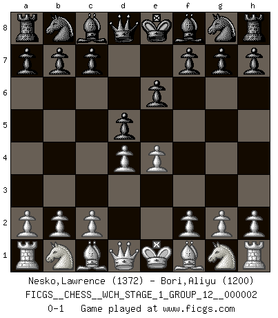 Last move : 0-1 2007 February 27 11:59:5 [Event "FICGS__CHESS__WCH_STAGE_1_GROUP_12__000002"] [Site "FICGS"] [Date "2007.01.16"] [Round "1"] [White "Nesko,Lawrence"] [Black "Bori,Aliyu"] [Result "0-1"] [WhiteElo "1372"] [BlackElo "1200"] 1.d4 e6 2.e4 d5 0-1 This chess game has been lost on time (started : 2007.01.16 15:23:38) Queen's pawn Player Black won this chess game. Follow this game move after move (download)Chess is a matter of delicate judgment, knowing when to punch and how to duck. (Bobby Fischer) Ich verlor meine Bürgerrechte, mein Gehalt wurde mir nicht mehr bezahlt und ich wurde zensiert und durfte nicht mehr ins Ausland reisen. [nach dem Match Fischer-Taimanov 6:0] (Mark Taimanov) No solamente yo pronostico su triunfo sobre Botvinnik, sino que me adelanto y digo que probablemente Fischer es el jugador de Ajedrez mas grande que haya existido. (John Collins) Je menace de comprendre la position. (Anonyme) Faith : not wanting to know what is true. (Friedrich Nietzsche)