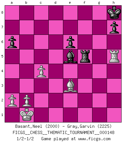 Last move : 1/2-1/2 2012 September 26 12:24:23 [Event "FICGS__CHESS__THEMATIC_TOURNAMENT__000148"] [Site "FICGS"] [Date "2012.05.09"] [Round "1"] [White "Basant,Neel"] [Black "Gray,Garvin"] [Result "1/2-1/2"] [WhiteElo "2000"] [BlackElo "2225"] 1.e4 c5 2.Nf3 d6 3.d4 cxd4 4.Nxd4 Nf6 5.Nc3 g6 6.Be3 Bg7 7.f3 O-O 8.Qd2 Nc6 9.O-O-O d5 10.Kb1 Nxd4 11.e5 Nxf3 12.gxf3 Nh5 13.Nxd5 Be6 14.f4 Qxd5 15.Qxd5 Bxd5 16.Rxd5 Bh6 17.Be2 Bxf4 18.Bc5 e6 19.Rd7 Rfd8 20.Rxb7 Bxe5 21.Bxh5 gxh5 22.Rg1+ Kh8 23.Rxf7 Bxh2 24.Rh1 a6 25.Be3 Be5 26.c4 Rf8 27.Rxf8+ Rxf8 28.Rxh5 Rf5 1/2-1/2 Sicilian : Dragon, Yugoslav attack, 7...O-O Kingside Castling by player Black (move 7) Queenside Castling by player White (move 9) This chess game ended in a draw. Follow this game move after move (download)The older I grow, the more I value pawns. (Paul Keres) Rauchen ist dem Schachspieler bei seiner Arbeit, also im Wettkampf, untersagt. (Viktor Kortschnoi) No todos los artistas son jugadores de Ajedrez, pero todos los jugadores de Ajedrez son artistas. (Marcel Duchamp) Si rien de grave n'est détecté lors de l'analyse d'une position, on joue alors le coup. Seconde règle de Blumenfeld. Beta. Software undergoes beta testing shortly before it's released. Beta is latin for still doesn't work. (Anonymous)