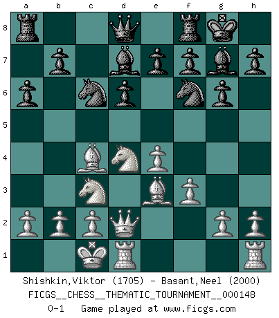 Last move : 0-1 2012 October 16 9:58:54 [Event "FICGS__CHESS__THEMATIC_TOURNAMENT__000148"] [Site "FICGS"] [Date "2012.05.09"] [Round "1"] [White "Shishkin,Viktor"] [Black "Basant,Neel"] [Result "0-1"] [WhiteElo "1705"] [BlackElo "2000"] 1.e4 c5 2.Nf3 d6 3.d4 cxd4 4.Nxd4 Nf6 5.Nc3 g6 6.Be3 Bg7 7.f3 O-O 8.Qd2 Nc6 9.Bc4 Bd7 10.O-O-O a6 0-1 Sicilian : Dragon, Yugoslav attack, 7...O-O Kingside Castling by player Black (move 7) Queenside Castling by player White (move 10) Player Black won this chess game. Follow this game move after move (download)The essence of Chess is thinking about what Chess is. (David Bronstein) Schach ist ein Kampf gegen den Fehler. (Johannes Herrman Zukertort) Dios mío, Bobby Fischer juega tan simple. (Alexei Suetin) Avant la finale, les dieux ont créé le milieu de partie. (Tarrasch) Luck is when opportunity knocks and you answer. (Anonymous)