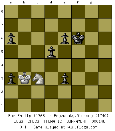 Last move : 0-1 2012 August 31 18:28:52 [Event "FICGS__CHESS__THEMATIC_TOURNAMENT__000148"] [Site "FICGS"] [Date "2012.05.09"] [Round "1"] [White "Roe,Philip"] [Black "Payzansky,Aleksey"] [Result "0-1"] [WhiteElo "1765"] [BlackElo "1740"] 1.e4 c5 2.Nf3 d6 3.d4 cxd4 4.Nxd4 Nf6 5.Nc3 g6 6.Be3 Bg7 7.f3 O-O 8.Qd2 Nc6 9.Bc4 Bd7 10.O-O-O Rc8 11.Bb3 Ne5 12.Kb1 a6 13.h4 h5 14.g4 hxg4 15.h5 Nxh5 16.Rdg1 Qa5 17.Bh6 Bf6 18.fxg4 Bxg4 19.Bxf8 Kxf8 20.Qe3 Rxc3 21.Qxc3 Qxc3 22.bxc3 e6 23.Bc4 Nxc4 24.Rxg4 Be5 25.Rg2 b5 26.a4 bxa4 27.Ka2 Ng3 28.Rh4 Kg8 29.Nf3 Ne3 30.Nxe5 Nxg2 31.Rg4 Nxe4 32.Nxg6 Nxc3+ 33.Ka3 Ne3 34.Rg3 Nxc2+ 35.Kb2 Ne4 36.Rg4 f5 37.Rxe4 fxe4 38.Kxc2 Kf7 39.Nf4 Kf6 40.Ne2 d5 41.Nc3 a3 42.Kb3 e3 0-1 Sicilian : Dragon, Yugoslav attack, 7...O-O Kingside Castling by player Black (move 7) Queenside Castling by player White (move 10) 10 pieces endgame at move 37 : White KRN , Black KNPPPPP WHITE : King + 1 Rook 1 Knight BLACK : King + 1 Knight 5 Pawns 9 pieces endgame at move 37 : White KN , Black KNPPPPP WHITE : King + 1 Knight BLACK : King + 1 Knight 5 Pawns 8 pieces endgame at move 38 : White KN , Black KPPPPP WHITE : King + 1 Knight BLACK : King + 5 Pawns Player Black won this chess game. Follow this game move after move (download)It began to feel as though you were playing against Chess itself. - On playing against Robert Fischer. (Walter Shipman) Wie, soll nun auch die Opposition abgeschafft werden? Ja, es tut mir leid, Ihnen diesen Schmerz nicht ersparen zu können. (Aaron Nimzowitsch) El Ajedrez no es una pizca de inferior al violín, y tenemos un gran número de violinistas profesionales. (Mikhail Botvinnik) La solitude du joueur d'Echecs à l'approche du mat est semblable à celle du condamné. (Francis Szpiner) Dave, my mind is going. I can feel it. (HAL 9000 in 2001, a space odyssey)