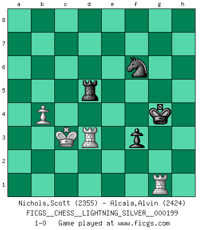 Last move : 1-0 2012 May 10 17:54:12 [Event "FICGS__CHESS__LIGHTNING_SILVER__000199"] [Site "FICGS"] [Date "2012.05.10"] [Round "1"] [White "Nichols,Scott"] [Black "Alcala,Alvin"] [Result "1-0"] [WhiteElo "2355"] [BlackElo "2424"] 1.e4 c5 2.Nf3 d6 3.d4 cxd4 4.Nxd4 Nf6 5.Nc3 a6 6.Be3 e5 7.Nb3 Be6 8.f3 h5 9.Be2 Nbd7 10.Nd5 Bxd5 11.exd5 g6 12.Qd2 Bg7 13.O-O O-O 14.Na5 Qc7 15.c4 e4 16.f4 Ng4 17.Bxg4 hxg4 18.f5 Rae8 19.Rac1 gxf5 20.Nb3 Ne5 21.Nd4 Nxc4 22.Qb4 b5 23.Nxf5 Qd7 24.Nxg7 Kxg7 25.Bd4+ f6 26.Qc3 Ne5 27.Qg3 Re7 28.Qh4 Ref7 29.Rf4 Rh8 30.Qg3 f5 31.h3 Kg8 32.hxg4 Nxg4 33.Bxh8 Kxh8 34.Kf1 b4 35.Ke2 Kg8 36.Rc4 Qb5 37.b3 Qxd5 38.Rc8+ Kg7 39.Qh3 Nh6 40.g4 e3 41.Qxe3 Nxg4 42.Qd4+ Qe5+ 43.Kd2 Kh7 44.Rc1 Kg6 45.Rg1 Kh6 46.Kd3 Rd7 47.Rgf1 Qb5+ 48.Kd2 Qe5 49.Re1 Qxd4+ 50.Rxd4 Kg5 51.Rxb4 Rh7 52.Ra4 f4 53.Ra5+ Ne5 54.Rf1 Ra7 55.Rg1+ Kf5 56.Rd1 Rg7 57.Rxa6 f3 58.Rxd6 Rg2+ 59.Kc3 Rxa2 60.Rd8 Re2 61.Rf8+ Ke6 62.b4 Re3+ 63.Kd4 Re2 64.Rh1 Rd2+ 65.Kc3 Rd3+ 66.Kc2 Rd4 67.Re8+ Kf6 68.Re1 Nd7 69.Kc3 Rd5 70.R8e4 Kf5 71.Rd4 Nf6 72.Rd3 Kg4 73.Rg1+ 1-0 Sicilian : Najdorf, Byrne (English) attack Kingside Castling by player White (move 13) Kingside Castling by player Black (move 13) 10 pieces endgame at move 57 : White KRRPP , Black KRNPP WHITE : King + 2 Rooks 2 Pawns BLACK : King + 1 Rook 1 Knight 2 Pawns 9 pieces endgame at move 58 : White KRRPP , Black KRNP WHITE : King + 2 Rooks 2 Pawns BLACK : King + 1 Rook 1 Knight 1 Pawn 8 pieces endgame at move 59 : White KRRP , Black KRNP WHITE : King + 2 Rooks 1 Pawn BLACK : King + 1 Rook 1 Knight 1 Pawn Player White won this chess game. Follow this game move after move (download)With or without the title, Bobby Fischer was unquestionably the greatest player of his time. (Burt Hochberg) Computer sind die einzigen Gegner, die nicht immer eine Ausrede auf Lager haben, wenn sie gegen mich verlieren. (Robert James Fischer) Ciertamente el estado mental actual de Bobby Fischer es una tragedia. Uno de los mas grandes jugadores de Ajedrez del mundo -el orgullo y pena del Ajedrez Americano. (Frank Brady) J'ai toujours senti une vague pitié pour l'homme qui ne connaît rien aux échecs, tout comme j'en aurais pour un homme ignorant de l'amour. Les Echecs, comme la musique ou comme l'amour, ont le pouvoir de rendre heureux. (Siegbert Tarrasch) Life is verb, not a noun. (Charlotte Perkins Gilman)